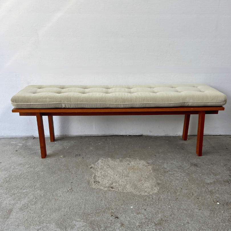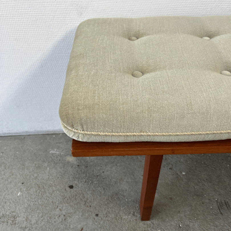 Dit unieke, vintage bankje straalt ingetogen elegantie uit. De combinatie van het warme teakhout en de lichte, grijs/groen velour bekleding maakt het tot een tijdloos meubelstuk dat moeiteloos past in zowel een modern als klassiek interieur. De strakke lijnen en het minimalistische ontwerp geven het bankje een serene uitstraling en het kussen zorgt voor die zacht touch. Of je het nu plaatst in een hal, aan het voeteneinde van een bed of als stijlvol accent in de woonkamer—dit bankje voegt karakter toe zonder te overheersen.