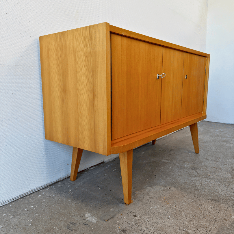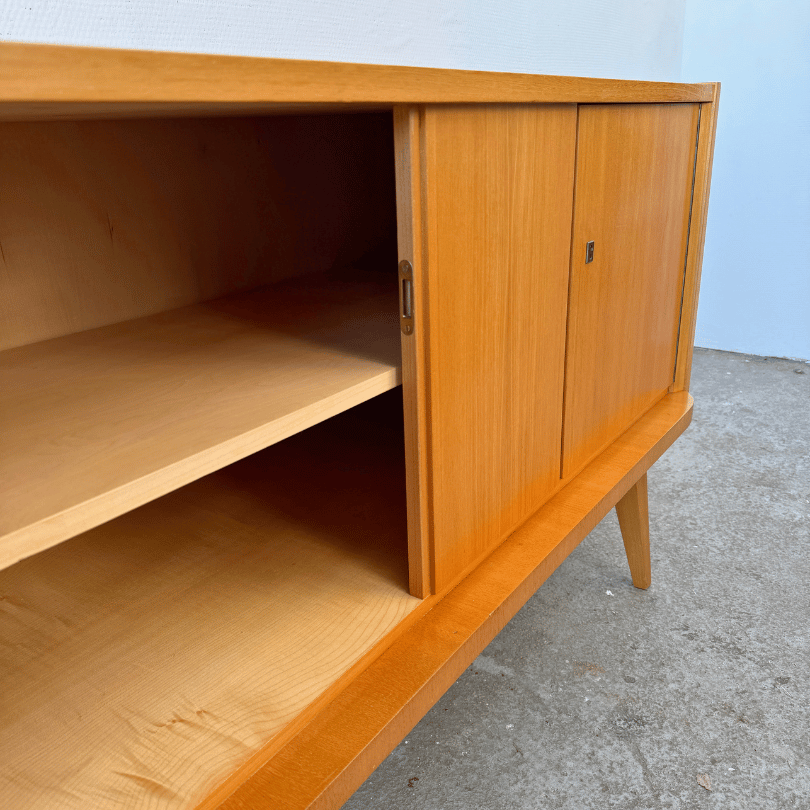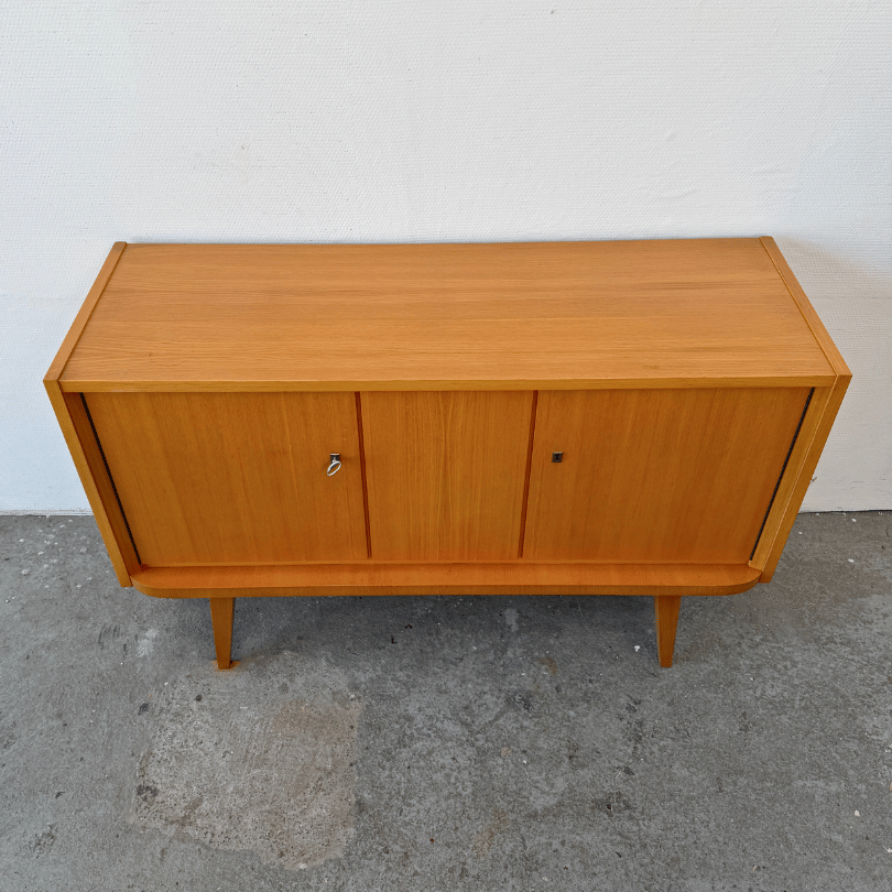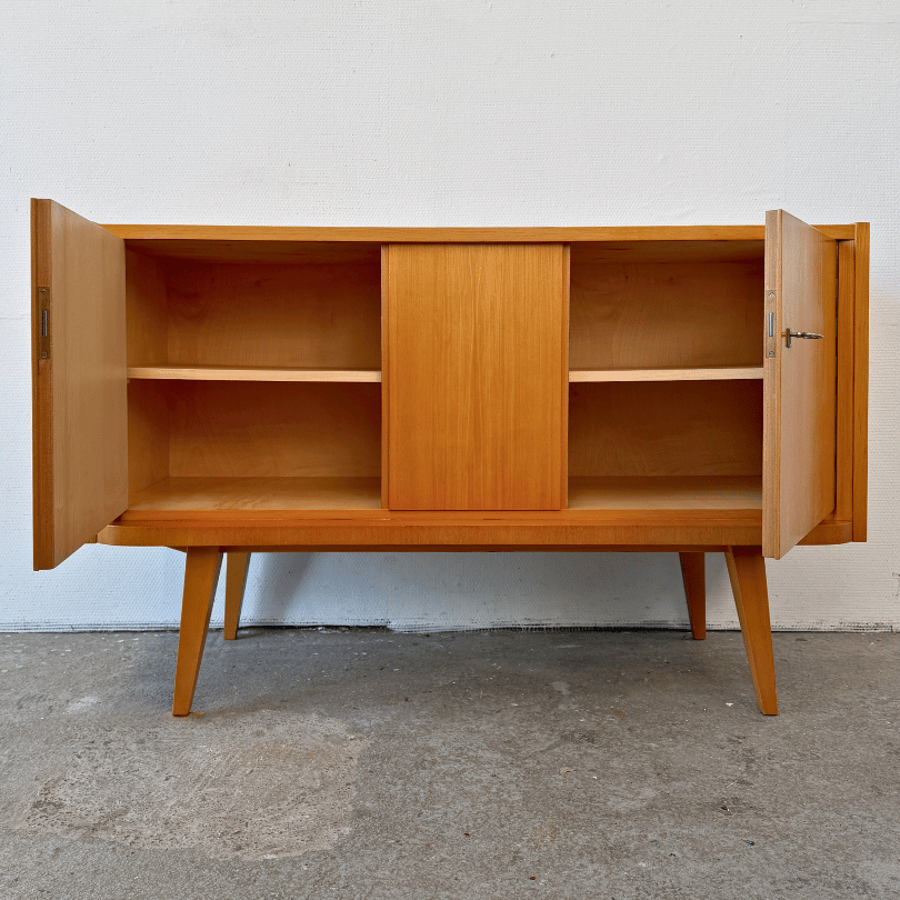 Vintage, midcentury dressoir van licht hout met 2 deurtjes en schuine pootjes.