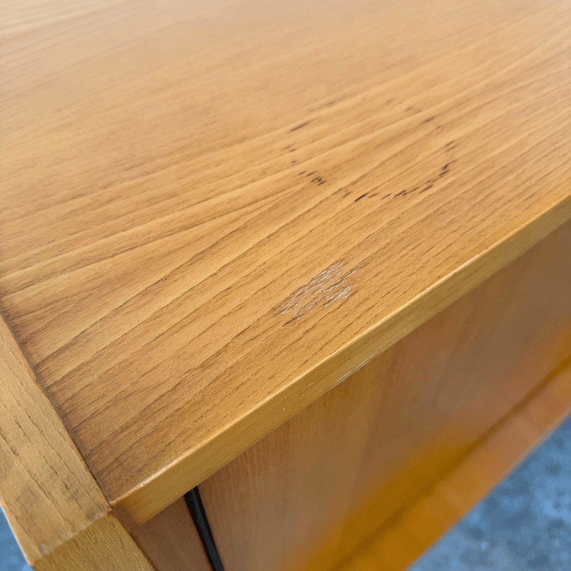 Het dressoir is nog in een goede vintage staat met gebruikssporen passend bij de leeftijd. Meest opvallend zijn een vlekje en dunne kring linksvoor op het blad, maar vallen alleen op van dichtbij – zie ook de foto’s. De (enige) sleutel past op beide deuren.
