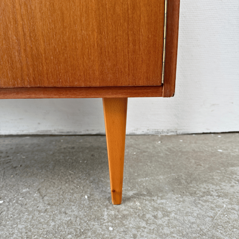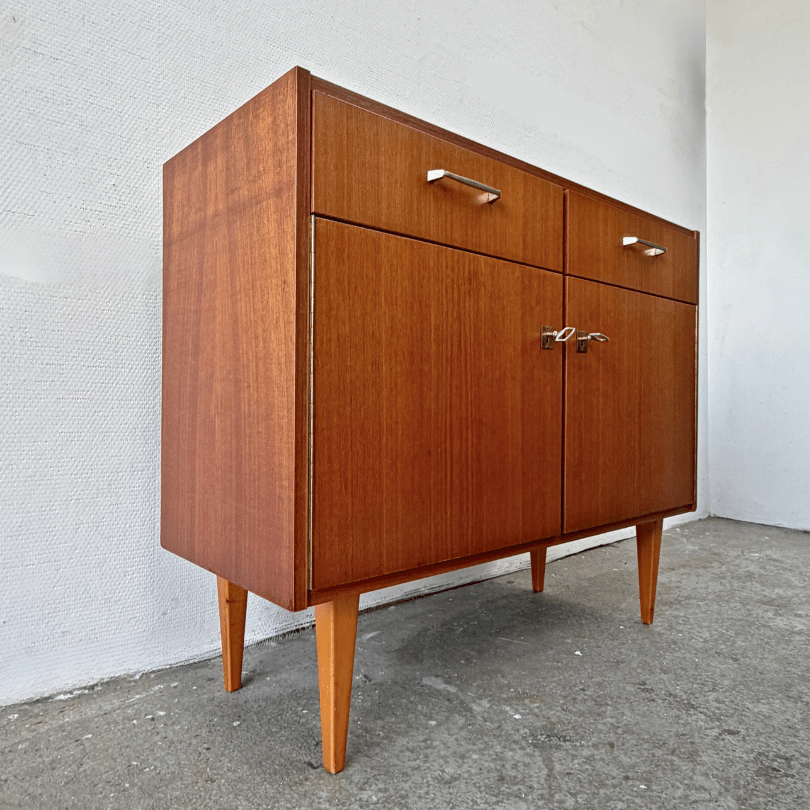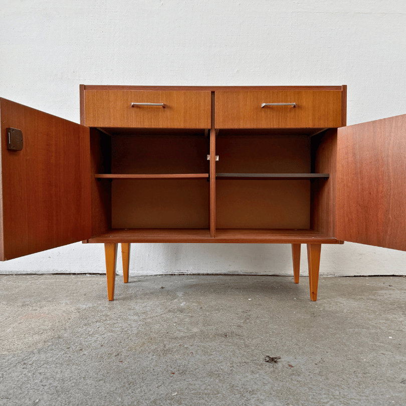 Compact midcentury dressoirtje van teakfineer met 2 lades en deurtjes.