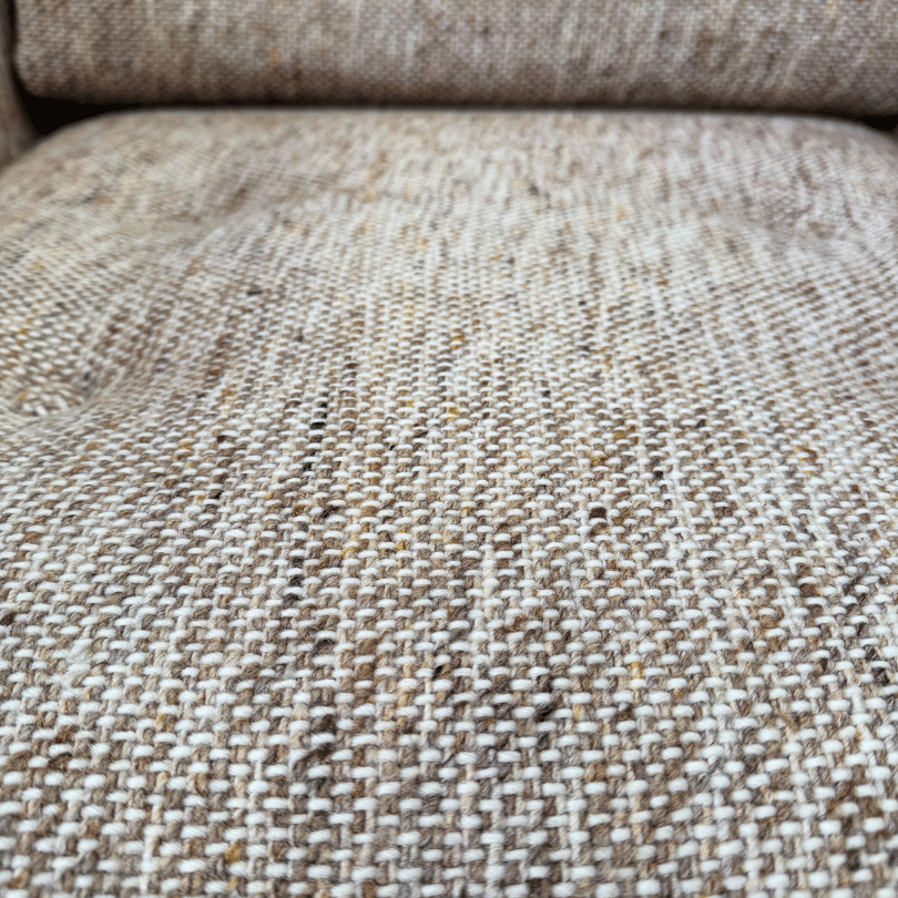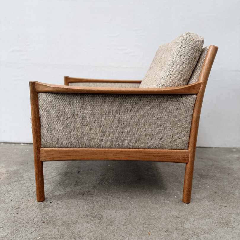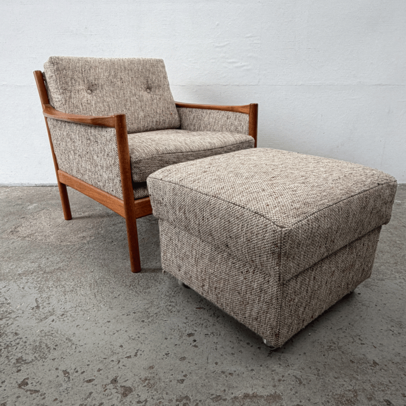 De kussens zijn nog comfortabel, precies dat fijne midcentury gevoel waarbij je goed wordt ondersteund maar toch ontspannen wegzakt. Optioneel is er een bijpassende hocker op wieltjes verkrijgbaar, in dezelfde tweed. Daarmee maak je van de fauteuil een complete loungeplek — ideaal voor lange avonden, een leeshoek of een rustige plek in de woonkamer. Een prachtig stuk voor wie houdt van Scandinavische eenvoud, natuurlijke materialen en vintage meubels met een rustige, volwassen uitstraling.
