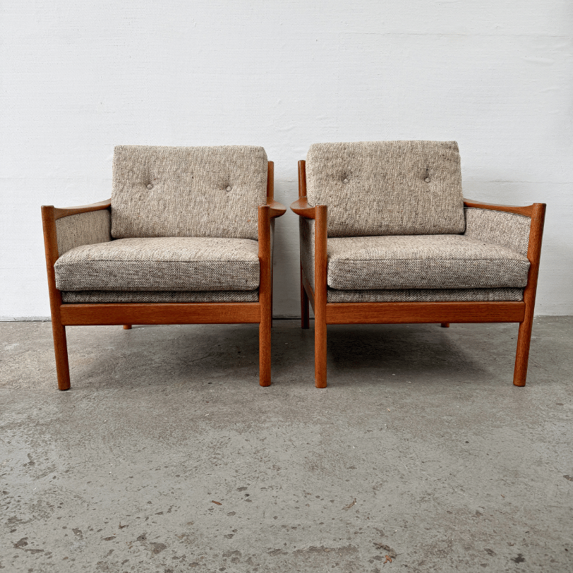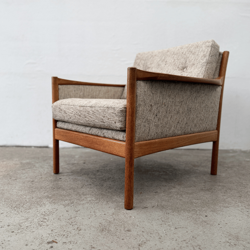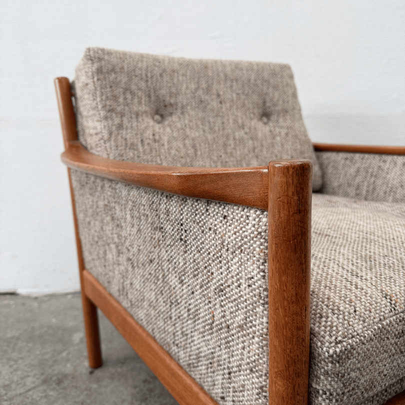 Vintage fauteuil met teakhouten frame en bekleed met gemêleerde tweed stof.
