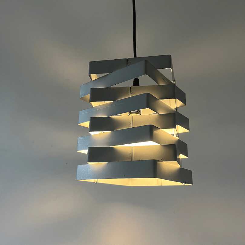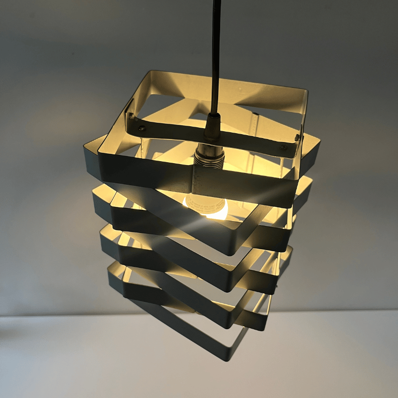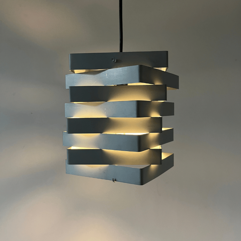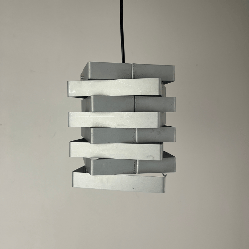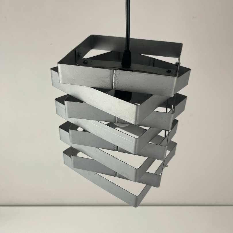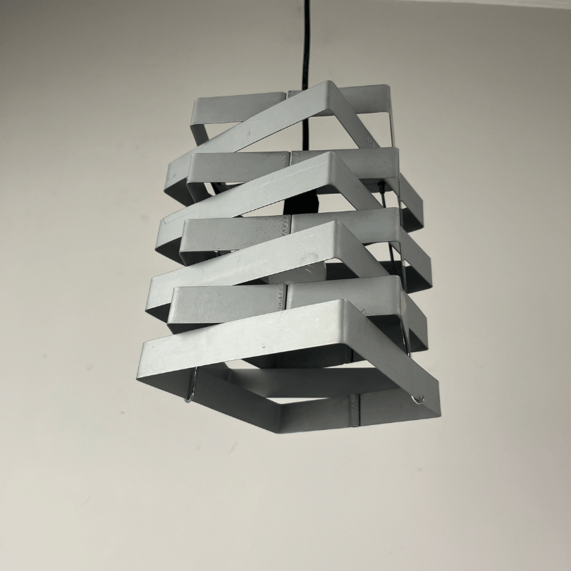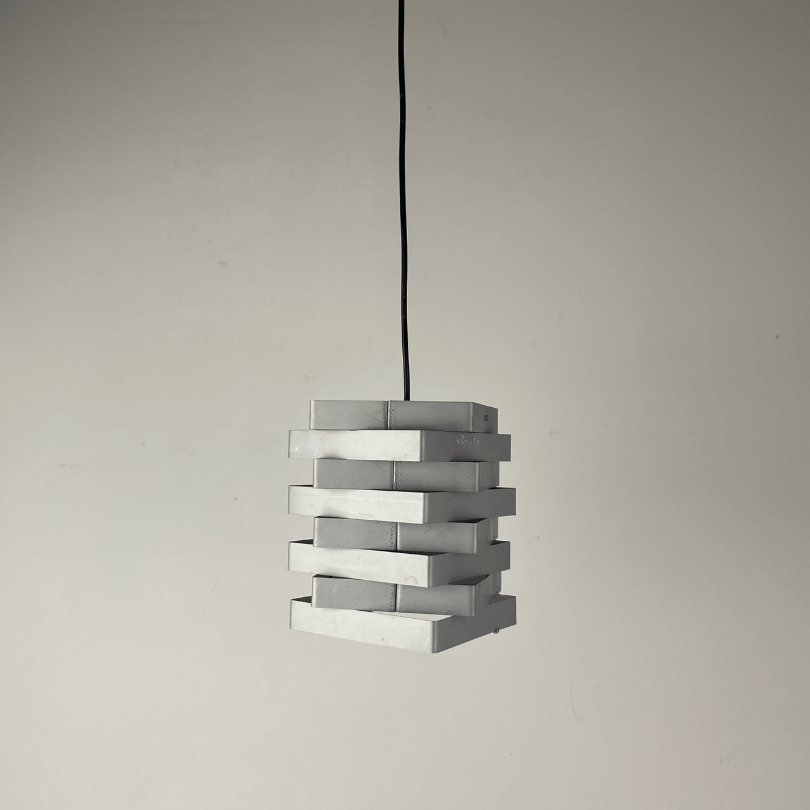 Deze opvallende hanglamp bestaat uit een reeks gelaagde, vierkante metalen lamellen die ‘gestapeld’ kruislings rond de lichtbron zijn geplaatst. Het ontwerp speelt met licht en schaduw, en creëert een dynamisch lijnenspel dat verandert afhankelijk van de kijkhoek. De lamp is uitgevoerd in mat metallic en hangt aan een zwarte snoerophanging, wat het industriële karakter versterkt.