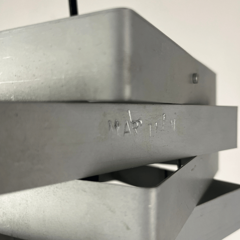 De vormgeving is verwant aan de Octav lamp van het Deense duo Esmann & Jensen en/of de geometrische lamp van Hoogervorst voor Anvia, maar deze lamp is niet gemerkt. Wel heeft (waarschijnlijk) de vorige eigenaar (?) de lamp zelf gemerkt met ‘Martijn’… zie laatste foto. Een grappig persoonlijk detail wat zo’n vintage lamp een eigen verhaal geeft!