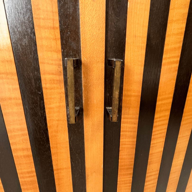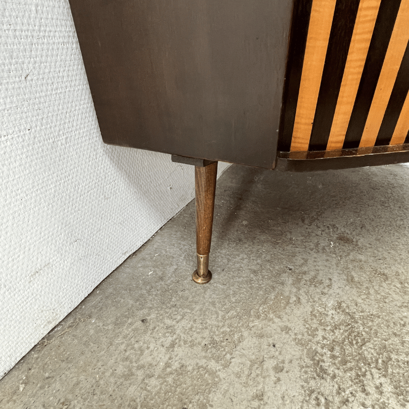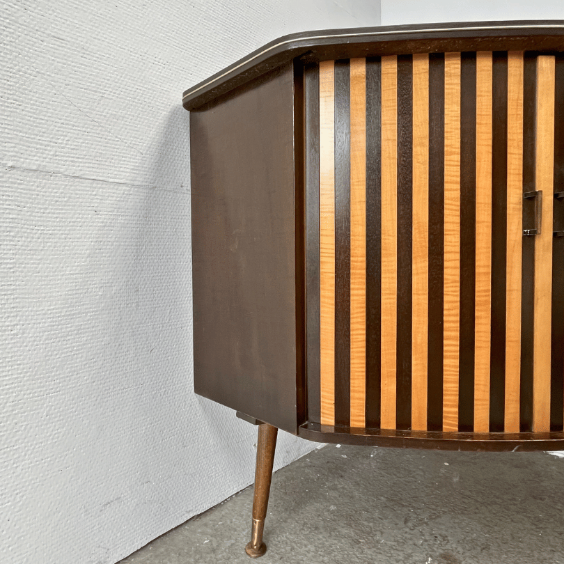 In dit vintage hoekkastje komen vorm, functie en verfijning samen. De tamboerdeuren, uitgevoerd in een ritmisch streeppatroon van afwisselend licht en donker houtfineer, geven het meubel een grafische elegantie die direct in het oog springt. De afgeronde hoeken en het compacte silhouet maken dit kastje bijzonder geschikt voor een stijlvolle hoekopstelling, terwijl de slanke, taps toelopende pootjes met messing accenten zorgen voor een luchtige, verfijnde uitstraling.