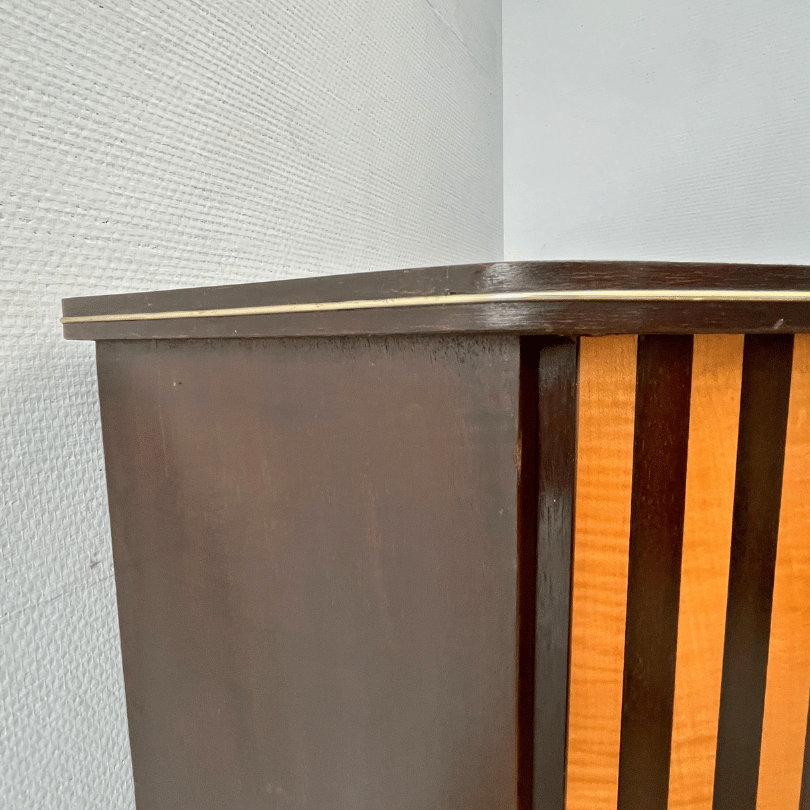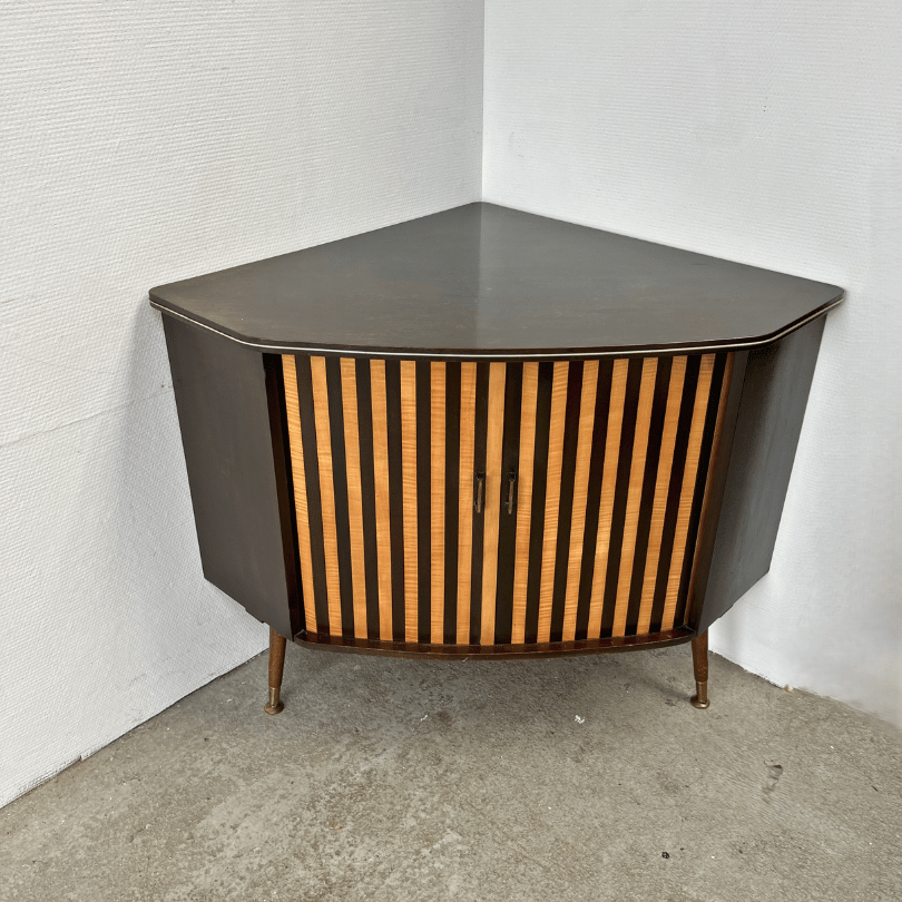 Vintage hoekkastje met tamboerdeuren in streeppatroon van 2 soorten fineer.