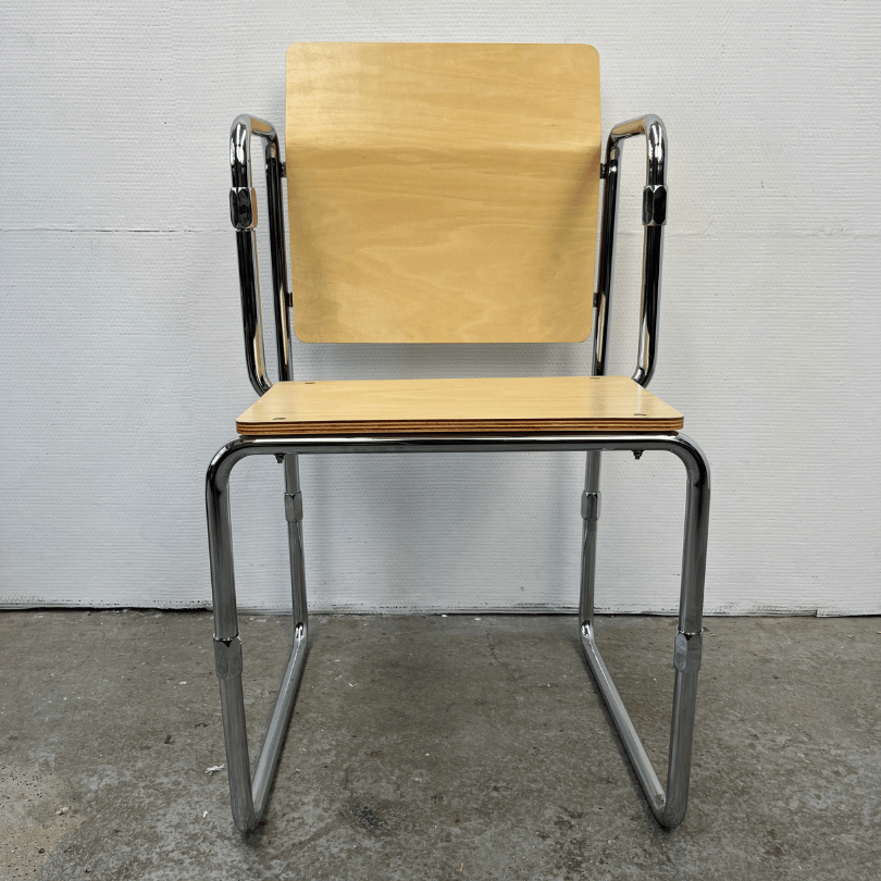 Heb je altijd al een echte Rietveld willen hebben? Dan is dit je kans! We bieden een zeldzame HOPMI stoel aan die in licentie van de erven Rietveld geproduceerd. Gemaakt van stalen, verchroomde buizen en een zitting en rugleuning van triplex.