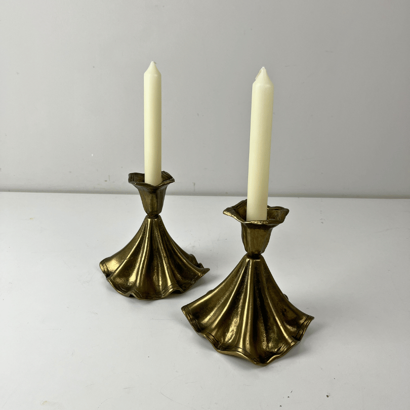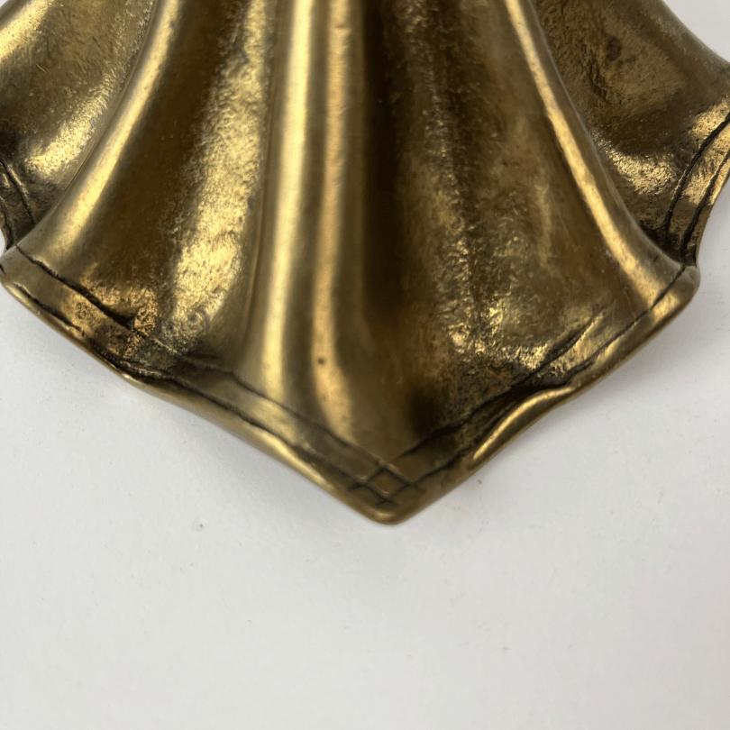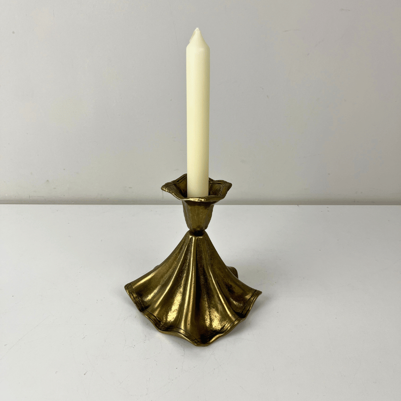Deze bijzondere kandelaar is uitgevoerd in gegoten messing met een warme, licht gepatineerde glans. De vorm doet denken aan een gevouwen linnen servet: golvend, geplooid en sierlijk uitwaaierend aan de voet, terwijl de bovenkant zich opent als een kaarshouder. Het geheel rust stevig op een brede basis en is geschikt voor een standaard dinerkaars.