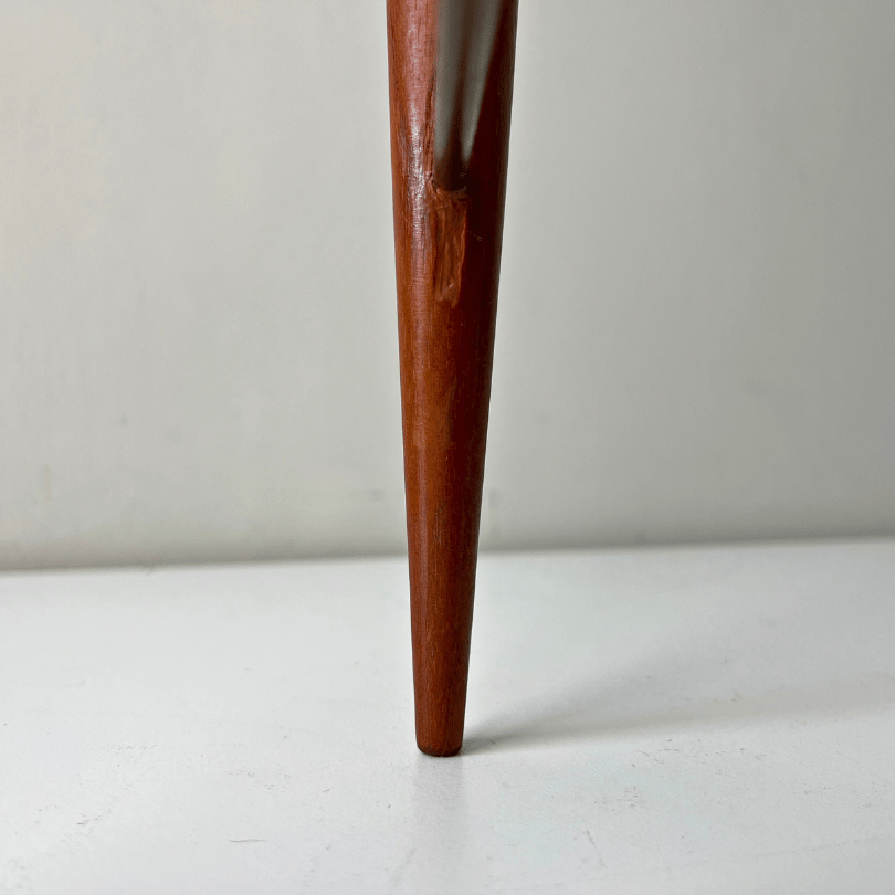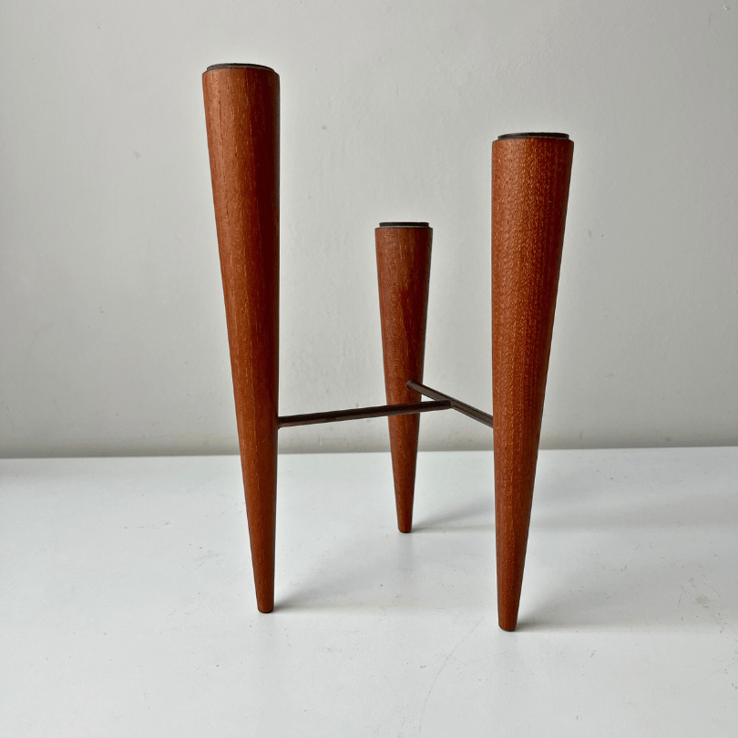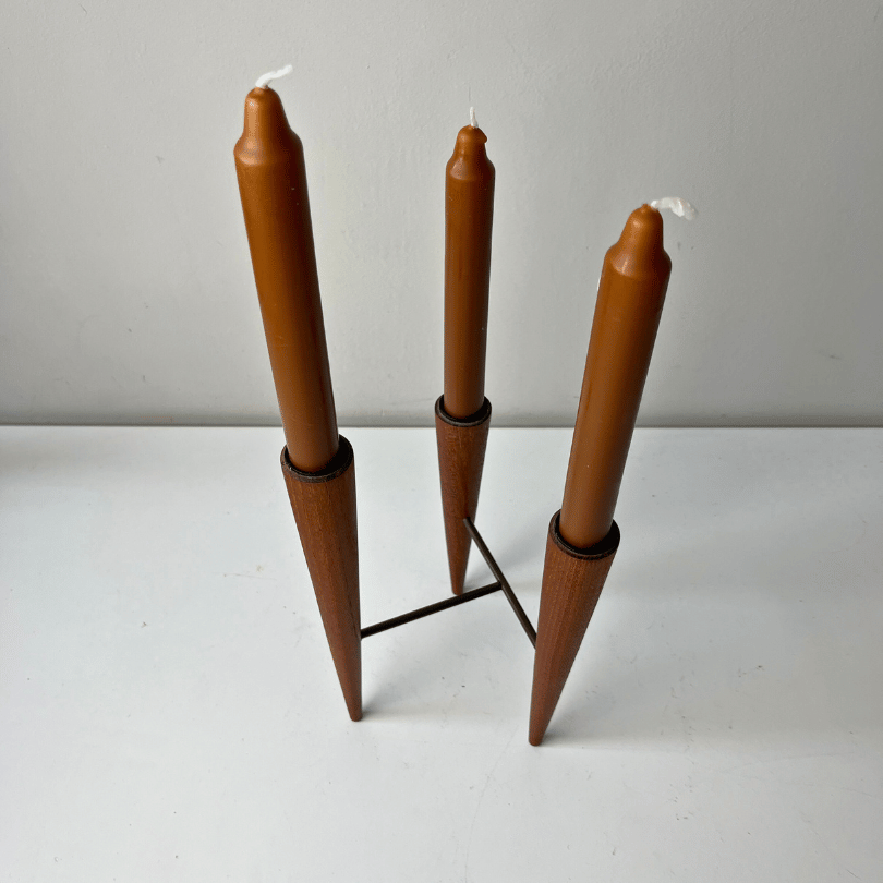 Deze zeldzame vintage kandelaar uit de jaren ’60 combineert warm teak met strak metaal in een compositie die zowel elegant als gedurfd is. De drie taps toelopende houten houders (variërende in hoogte) vormen samen een grafisch lijnenspel, subtiel verbonden door een slank metalen frame dat het geheel een architecturale uitstraling geeft. Elk element is zorgvuldig vormgegeven, met oog voor balans en materiaalcontrast—een typerende eigenschap van Scandinavisch design uit die periode. Dit is geen alledaagse kandelaar, maar een uniek, minimalistisch exemplaar dat karakter en verfijning brengt in elk interieur.