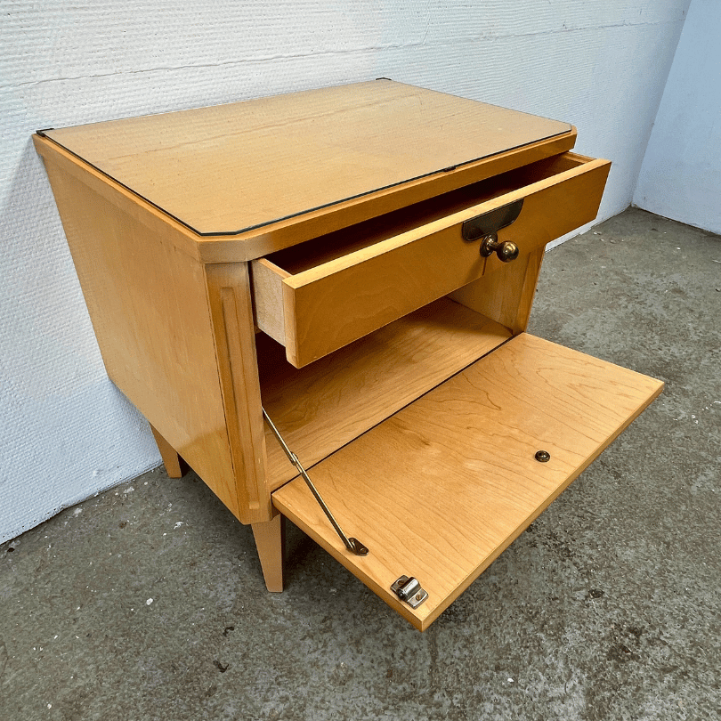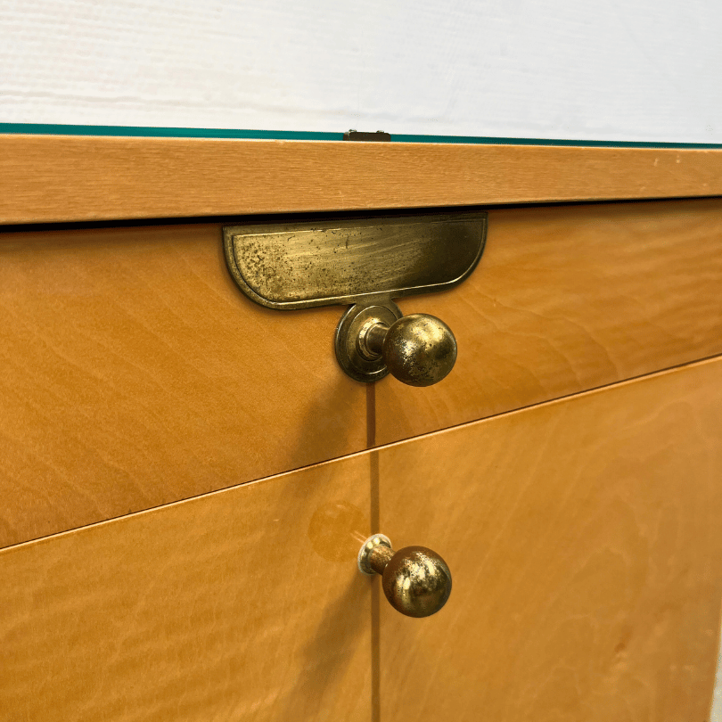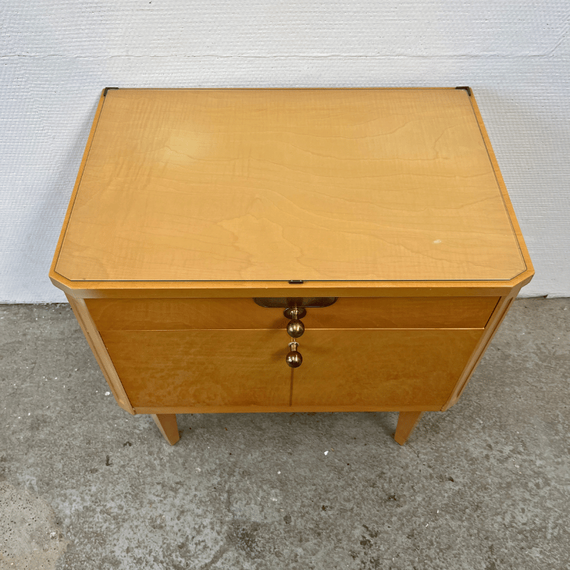Dit charmante klepkastje uit de jaren ’60 is een schoolvoorbeeld van mid-century modern design: strak, functioneel en met subtiele decoratieve accenten. Het kastje heeft slank toelopende pootjes en is uitgevoerd in lichtgekleurd houtfineer met een warme honingtoon en een zichtbaar nerfpatroon. De lade en het klepdeurtje zijn afgewerkt met ronde messing knoppen en een decoratief plaatje.