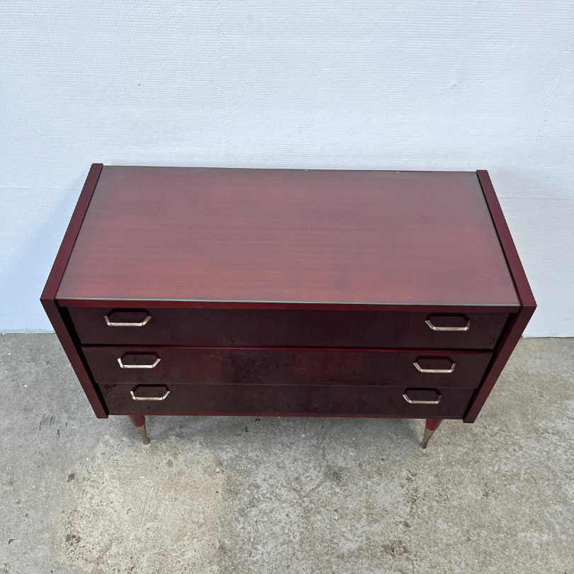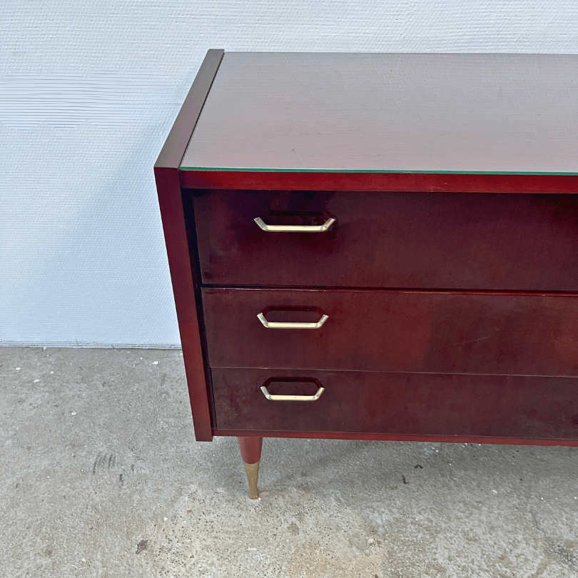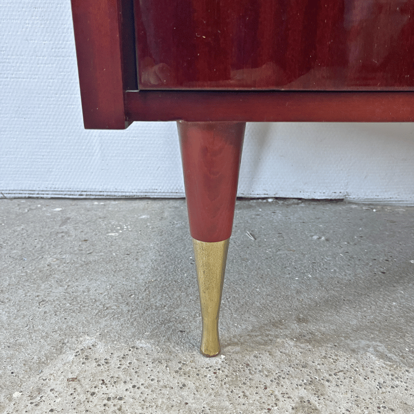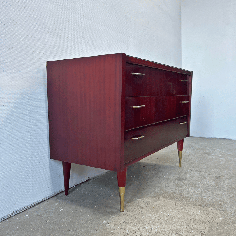 Deze ladekast met lage dressoir met 3 lades uit de jaren ’60 is een ode aan elegantie en vakmanschap. De strakke lijnen en het minimalistische ontwerp maken dit dressoir tijdloos. Het diepe, roodbruine mahoniehout (fineer) is afgewerkt met een hoogglans lak die de natuurlijke tekening van het hout prachtig accentueert en die – samen met de messing details – een luxueuze uitstraling geeft. De pootjes zijn taps toelopende en de voorste zijn afgewerkt met een messing voetje wat het mid-century modern karakter onderstreept.