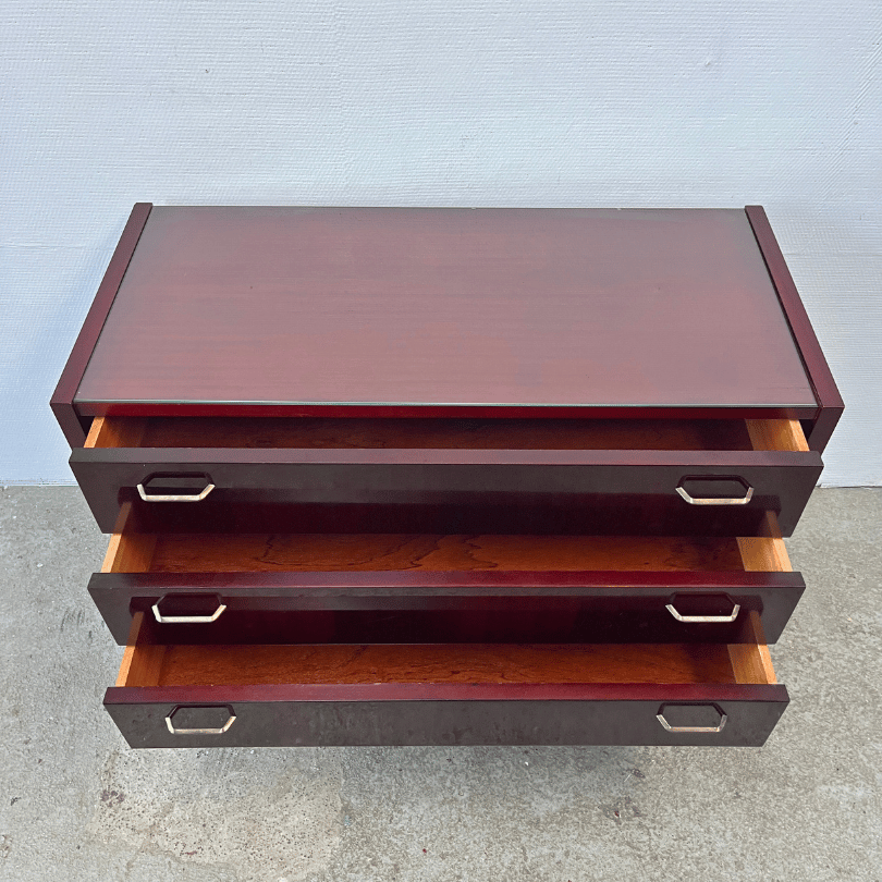 Vintage, midcentury ladekast van roodbruin mahonie (fineer) met messing details.