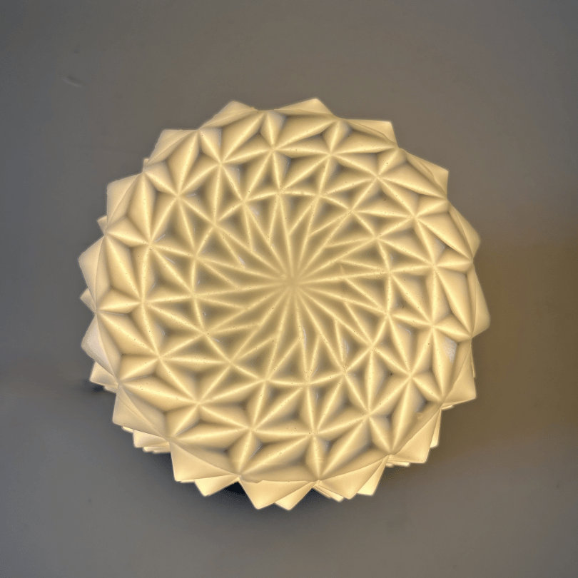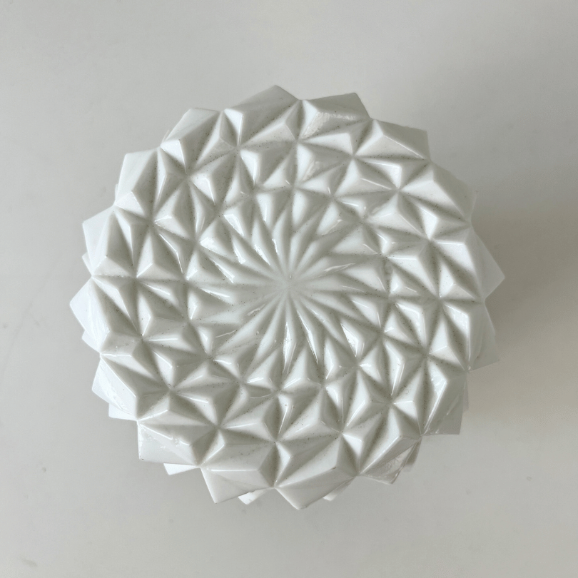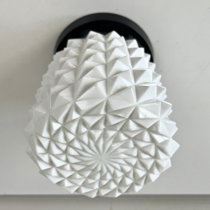 Dit opvallende plafondlampje is een ontwerp van Elektro Instala Jilove u Decina, een Tsjechische fabrikant die in de jaren ’60 en ’70 bekend stond om zijn sculpturale glasontwerpen en geometrische precisie. Dit model is een prachtig voorbeeld van hun karakteristieke stijl: een cilindervormige kap van wit glas, rijkelijk voorzien van een hobnail-patroon met piramidevormige facetten die het licht op een speelse manier breken en reflecteren. De zwarte kunststof plafondplaat vormt een krachtig contrast met het witte glas en benadrukt het strakke, moderne silhouet.