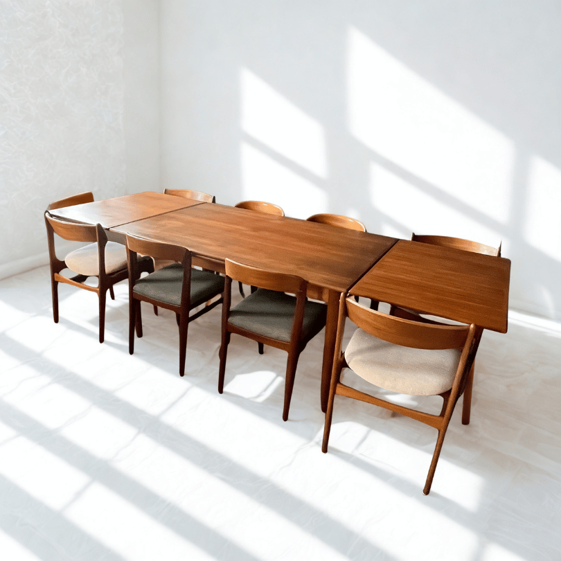 Midcentury modern design eettafel in teakhout met uitschuifbare bladen.