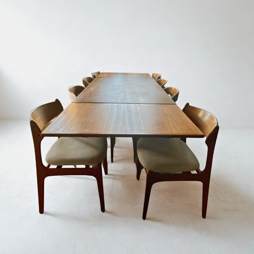 Let op: Binnenkort komen ook 6 eetkamerstoelen beschikbaar: ontworpen door Erik Buch in de jaren ’60, uitgevoerd in massief teak met een witte gestoffeerde zitting. Deze stoelen zijn geliefd om hun ergonomische vorm, zwevende zitting en verfijnde afwerking.
