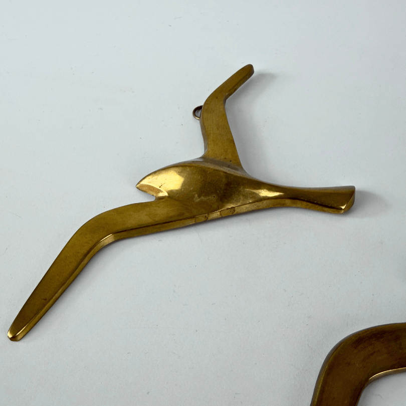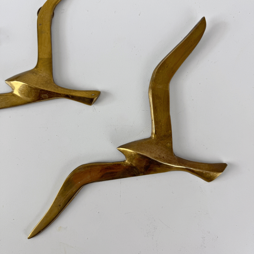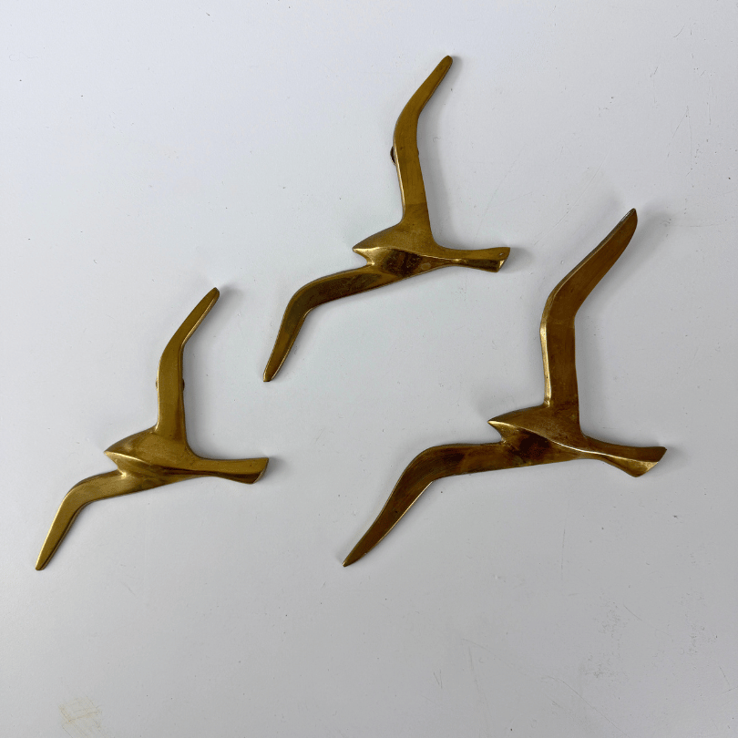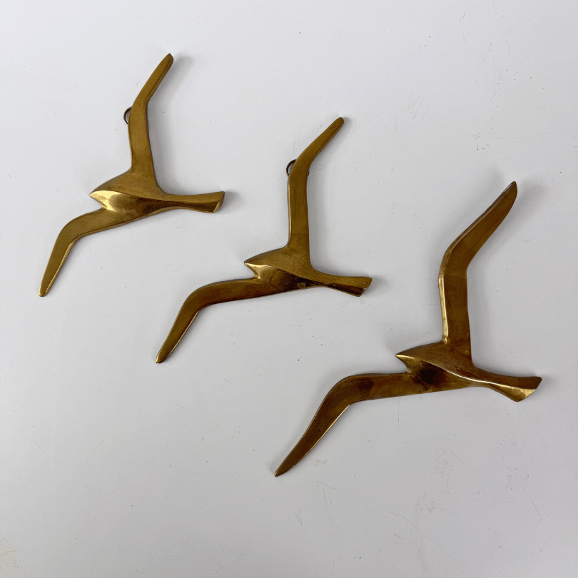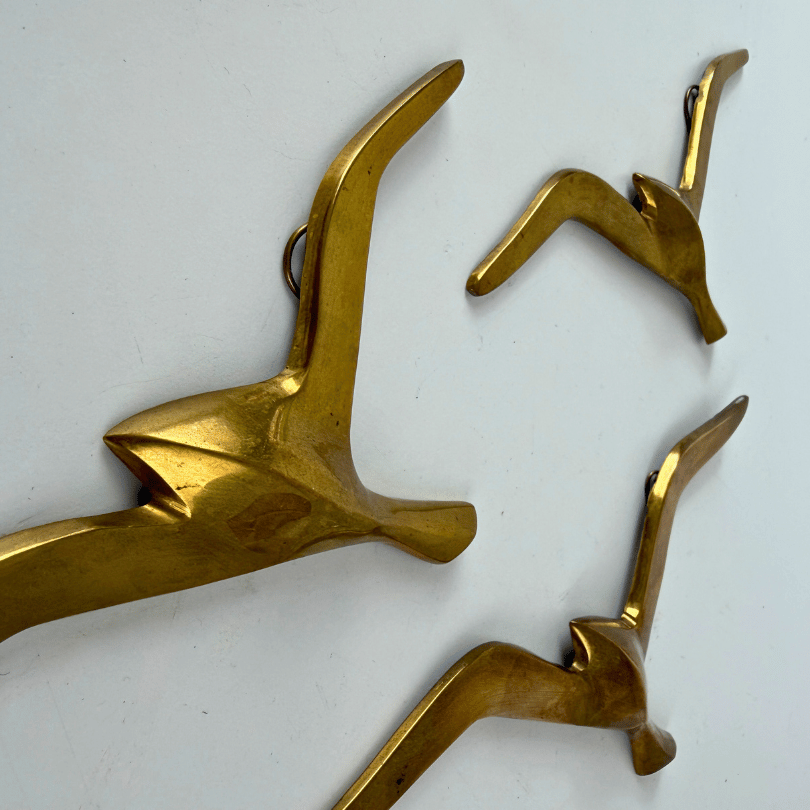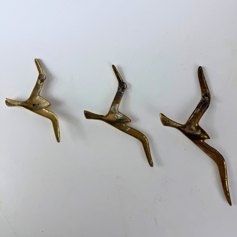 Vintage wanddecoratie van 3 dezelfde messing vogels met verschillende afmetingen.