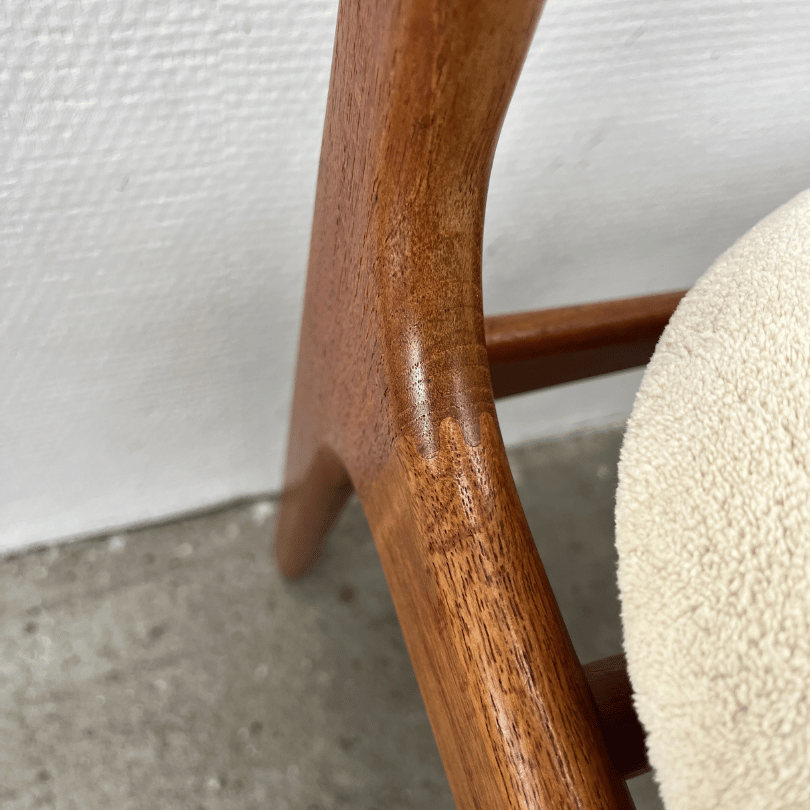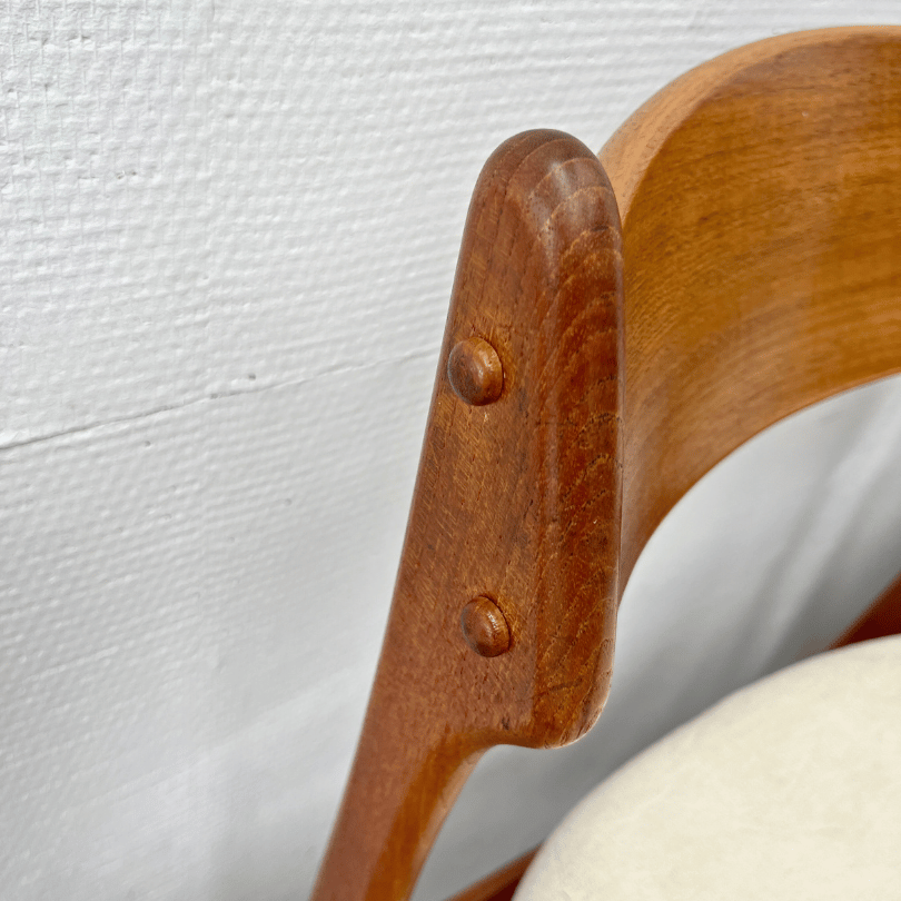 Een zeldzame vondst voor liefhebbers van Deens design: deze set van vier “Model 49” eetkamerstoelen, ontworpen door Erik Buch voor O.D. Møbler, belichaamt het vakmanschap en de elegantie van het Scandinavische modernisme. De subtiel gebogen houten rugleuningen bieden niet alleen ergonomisch comfort, maar geven de stoel ook een prachtig silhouet. De ‘zwevende’ zittingen zijn bekleed met de originele gebroken wit velours stof—een zachte, luxueuze touch die het warme hout prachtig contrasteert en het geheel een verfijnde uitstraling geeft.