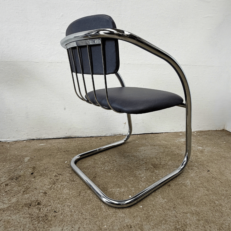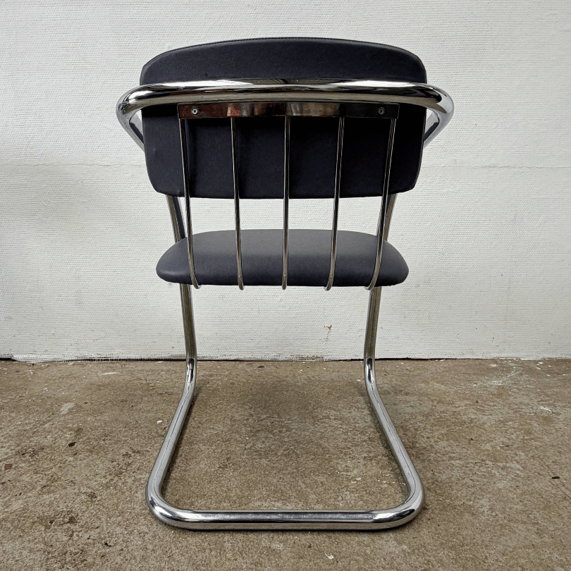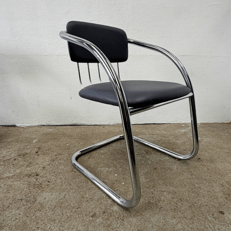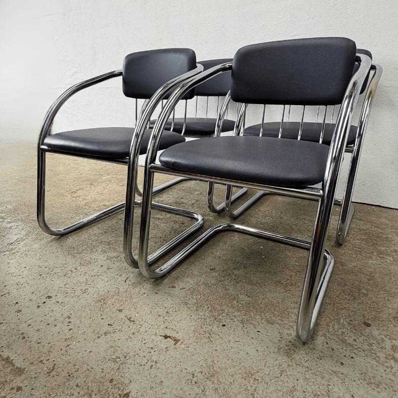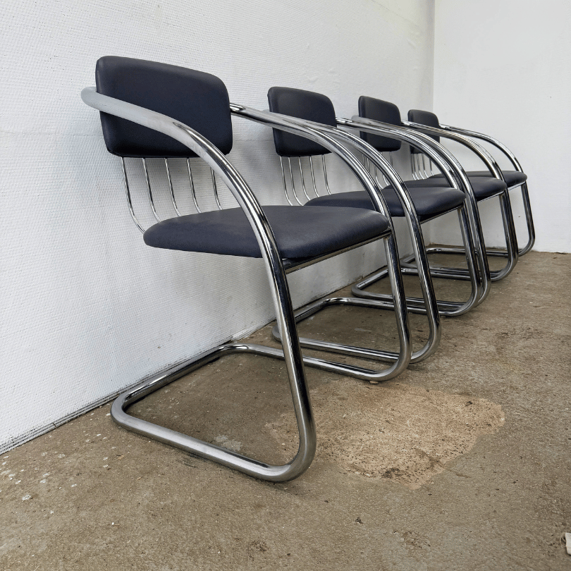 Deze set van vier vintage chromen stoelen ademt de elegantie van Italiaans design uit de jaren’70-‘80. De slanke, doorlopende buisconstructie en de vloeiende cantilever (slede) orm verwijzen duidelijk naar het werk van ontwerpers als Gastone Rinaldi, die bekend stond om zijn luchtige, grafische ontwerpen in verend staal. Het glanzende tubular steel frame vormt één doorlopende lijn — een ontwerpkeuze die deze stoelen hun lichte, bijna zwevende uitstraling geeft. De subtiele vering in het frame zorgt voor een comfortabele zit, precies zoals je verwacht van dit type modernistische stoel. De zittingen en rugleuningen zijn bekleed met blauw-grijs skai, een rustige, tijdloze keuze die ook de subtiele chromen lijnen aan de achterzijde goed tot hun recht laten komen.