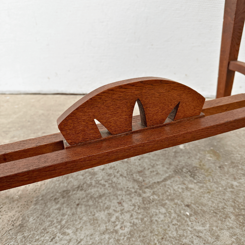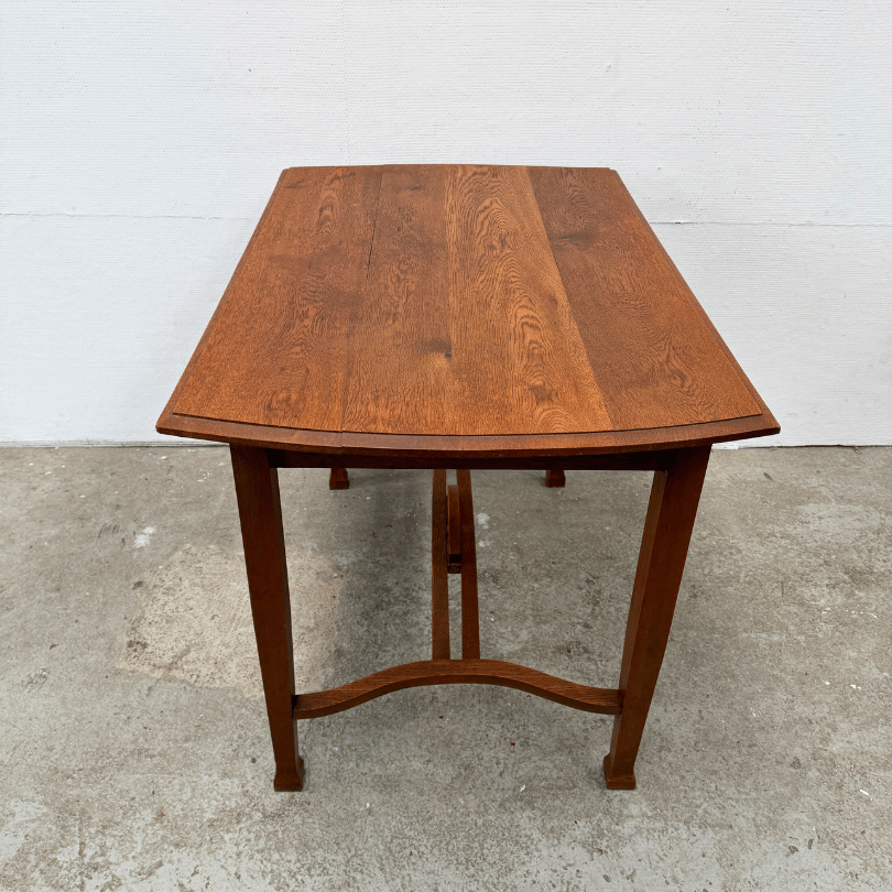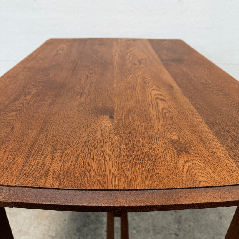 Deze tafel ademt de ingetogen elegantie van vroeg 20e eeuwse landelijke en ambachtelijke meubels: slanke, licht taps toelopende poten met voetje, een warm houten blad en een sierlijke tussenregel die niet alleen stevigheid geeft, maar ook een subtiel decoratief accent vormt. Dit soort tafels werd veel gezien in jaren ’30–’50 keukens en eetkamers, waar functionaliteit en eenvoud hand in hand gingen met verfijnd houtwerk. De stijl sluit naadloos aan bij wat je vaak ziet bij Art Nouveau‑naar‑Landelijk overgangsmeubels: geen overdadige ornamenten meer, maar wel aandacht voor vorm, verhoudingen en kleine details die het meubel karakter geven.
