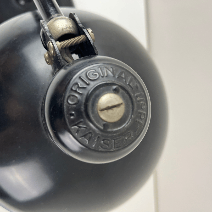 Deze prachtige zwart metaal Kaiser Idell 6556 tafellamp is een origineel exemplaar uit de jaren 40, met de iconische kap met reliëfopdruk “ORIGINAL KAISER-idell”.  Kaiser Idell-lampen, waaronder dit model, werden dankzij hun verstelbare mechaniek en tijdloze elegantie veelvuldig gebruikt in kantoren, werkplaatsen en woningen. Hun kenmerkende koepelvormige kappen en nauwkeurig ontworpen verbindingen maakten ze tot een vast onderdeel van het industriële design van de 20e eeuw.