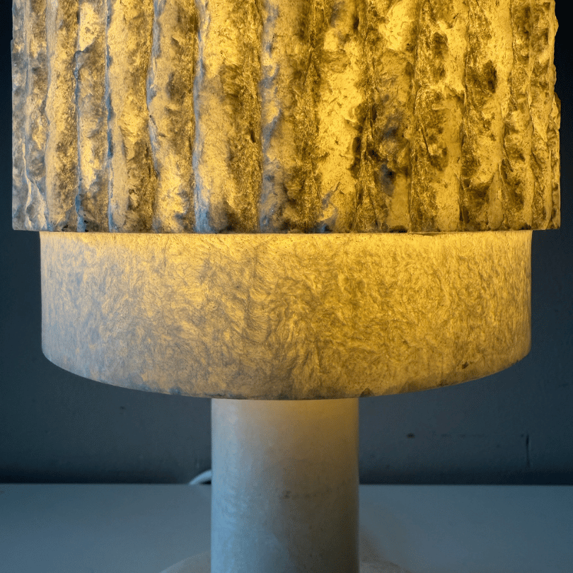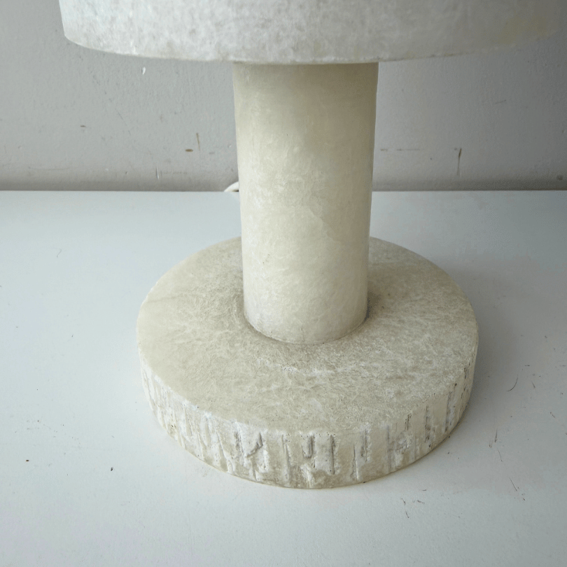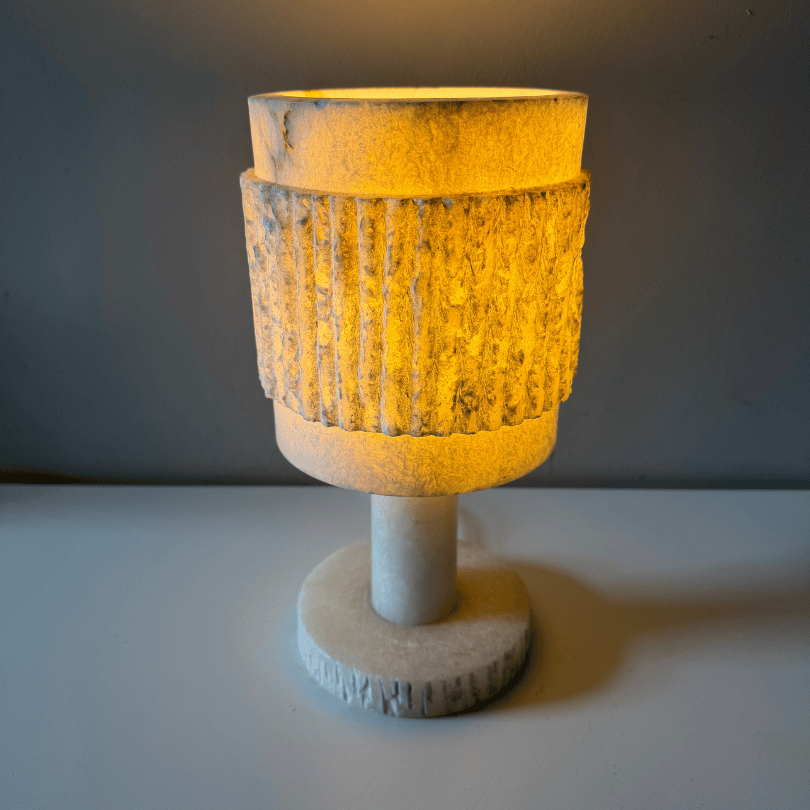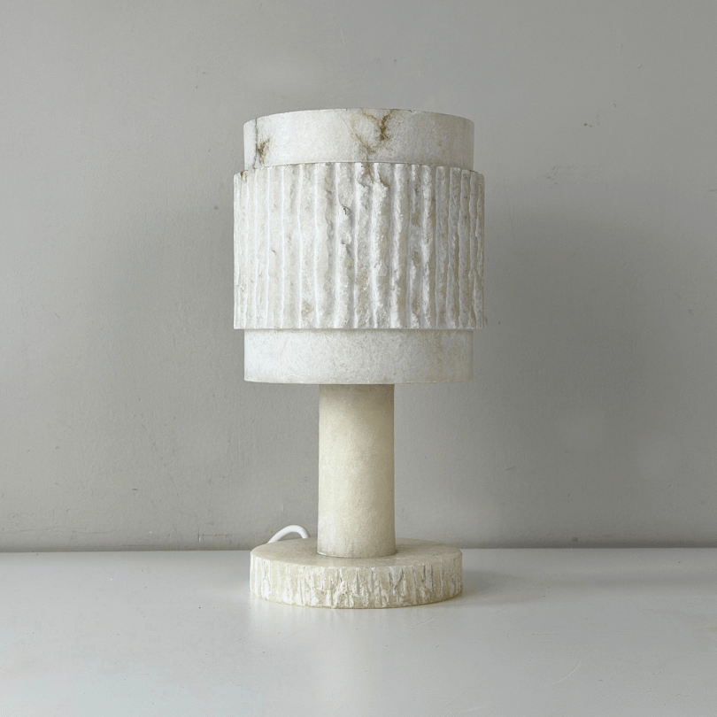 Dit albasten lampje heeft die bijzondere, bijna serene uitstraling die alleen natuursteen kan geven. Het zachte, warme licht dat door het albast heen gloeit, zorgt voor een rustige sfeer — alsof het licht zelf ademt. De cilindervormige kap en voet versterken dat gevoel van eenvoud en balans: geen franje, alleen pure materialen die voor zichzelf spreken.