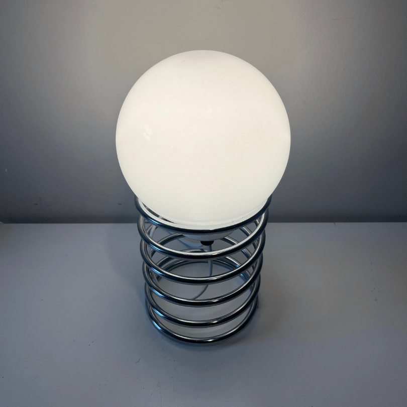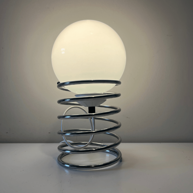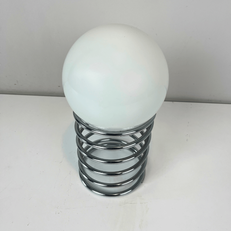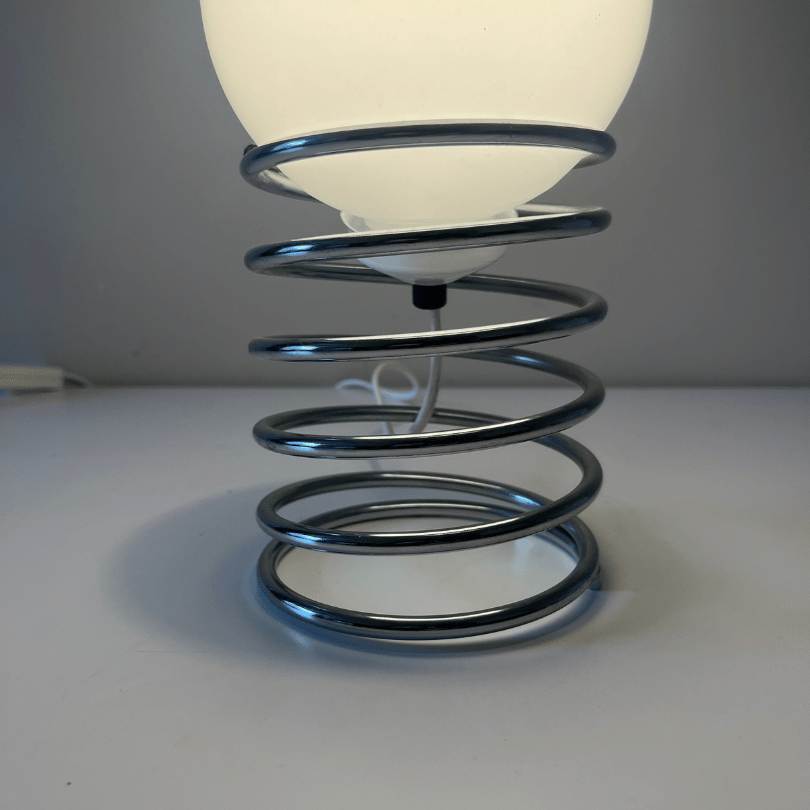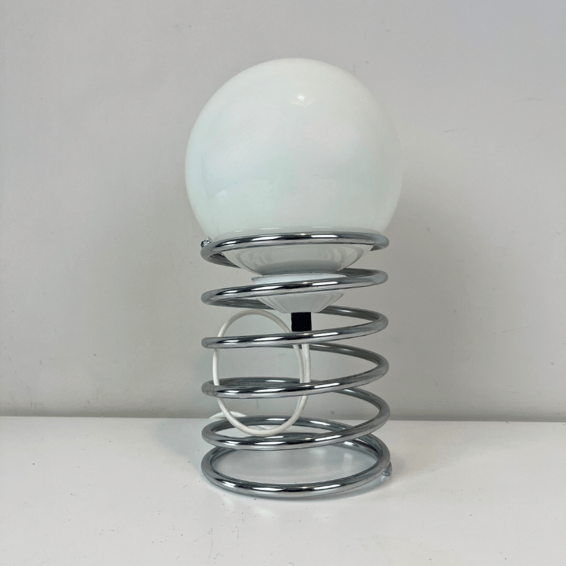 Vintage Space Age tafellamp met witglazen bol en spiraalvormige voet.