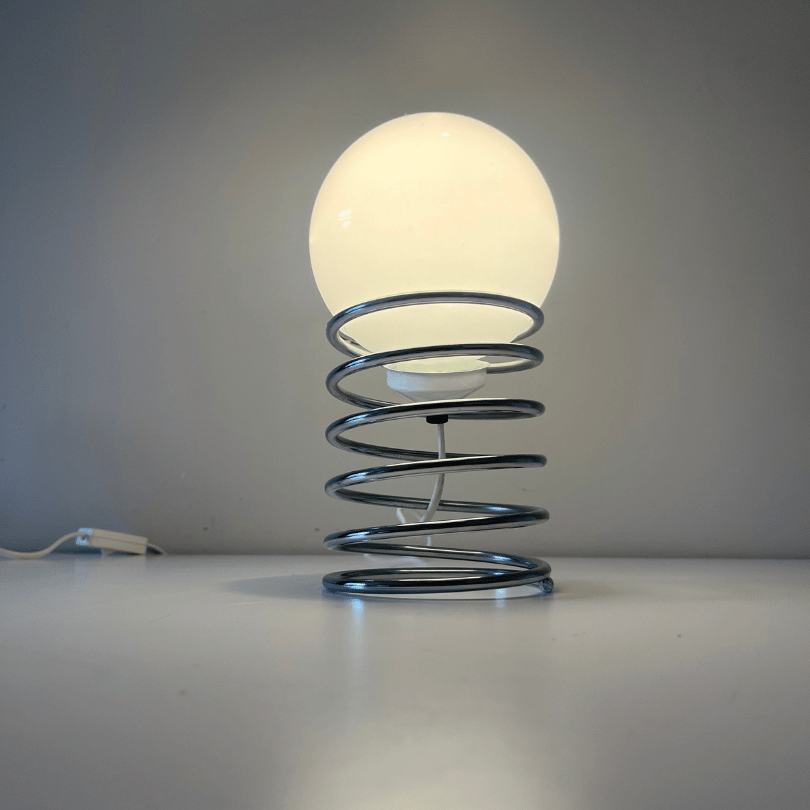 Deze bijzondere lamp combineert licht, vorm en beweging. De spiraalvormige voet van glanzend chroom slingert zich rond een centrale (losliggende) bolvormige lichtbron, die een warm en diffuus licht verspreidt. Het ontwerp is zowel minimalistisch als speels, en past perfect in een hedendaags interieur waar een lamp meer is dan alleen een lichtbron.