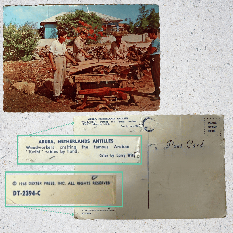 Dit natuurlijke, vintage tafeltje van Kwihi hout is een zeldzaam stuk met een verhaal. In de jaren ’60 met de hand gemaakt op Aruba door lokale houtbewerkers getuige de ansichtkaart die we erbij hebben gekregen. Dit tafeltje – vaak gebruikt als bijzettafel, plantentafeltje of klein kunstobject in huis – is opgebouwd uit ongerepte stukken Kwihi hout, een boomsoort die bekendstaat om zijn grillige vormen, warme tinten en uitzonderlijke hardheid. Dit soort tafeltjes hebben die typische, organische uitstraling die alleen ontstaat wanneer hout niet wordt gedwongen in een vorm, maar zijn eigen lijnen mag volgen. Met prachtige nerven en natuurlijke contouren, gevormd uit takken en worteldelen, waardoor elk stuk een uniek karakter krijgt — puur natuur, zonder opsmuk. Vandaag de dag passen ze perfect in interieurs die warmte, authenticiteit en natuurlijke materialen omarmen: Japandi, wabi sabi, rustiek modern of een eclectische mix.
