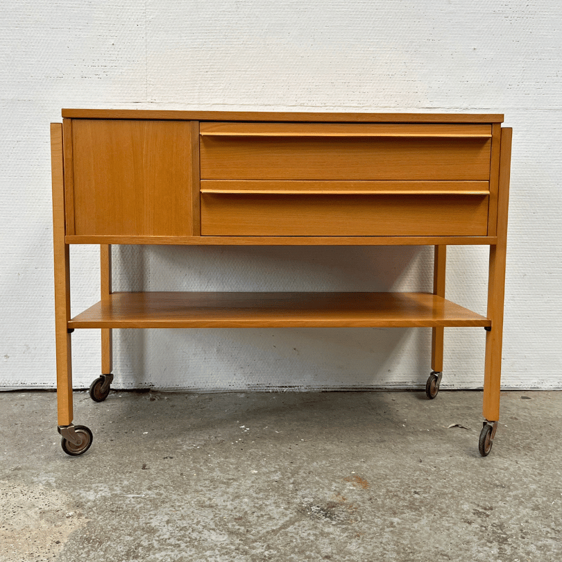 Dit is een houten naaikistje dat charme en functionaliteit moeiteloos combineert. Gemaakt van licht hout, met een natuurlijke uitstraling en een slimme indeling die uitnodigt tot het bewaren of verzamelen van allerlei snuisterijen. Onder de klep vind je een ruim vak én een bovenste lade met een inlay vol kleine vakjes — ideaal voor het ordenen van naaibenodigdheden, hobbyspullen of andere kleine schatten. Daaronder zit nog een tweede lade voor extra opbergruimte en een extra plank. Alles staat stevig op vier poten, elk voorzien van een soepel rollend wieltje: praktisch én elegant. Dit kastje is niet alleen een handige opberger, maar ook verrassend leuk als bijzettafeltje of nachtkastje. Let op: het kastje is gevuld met vintage naaibenodigdheden. Wil je die inhoud erbij? Dat mag natuurlijk!