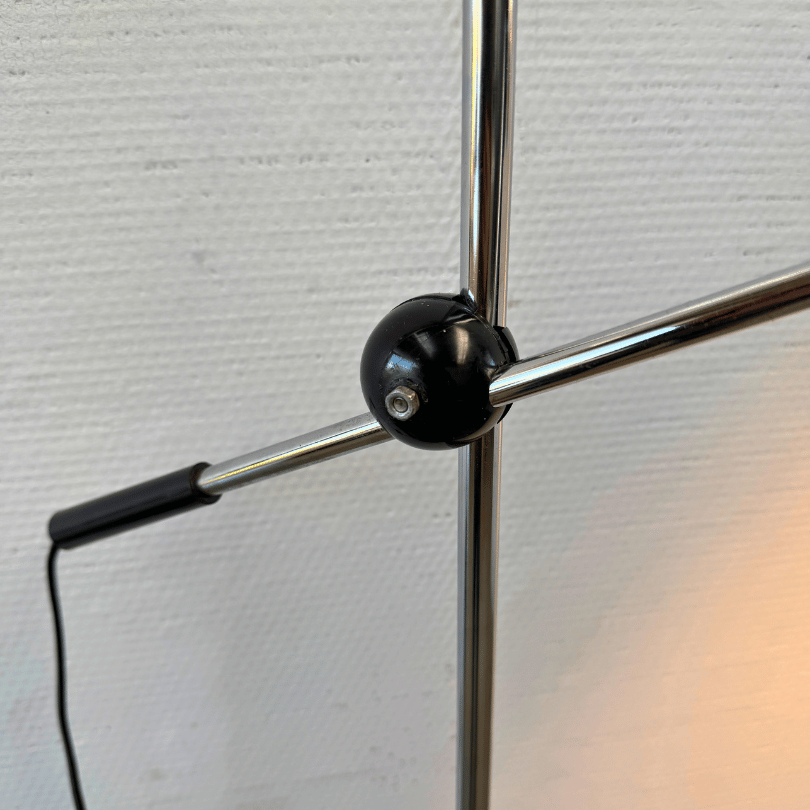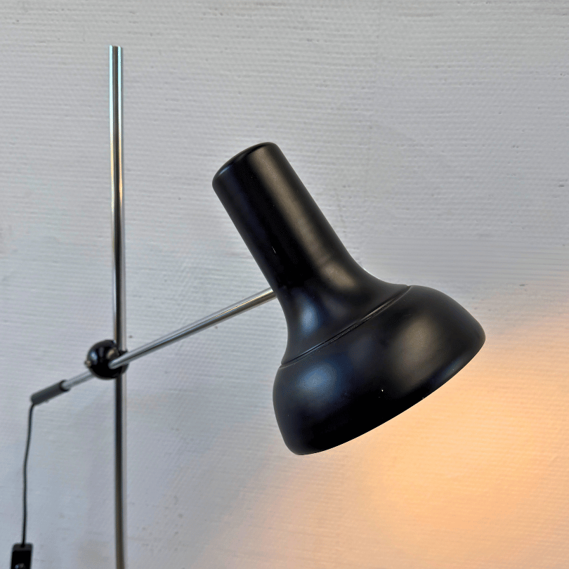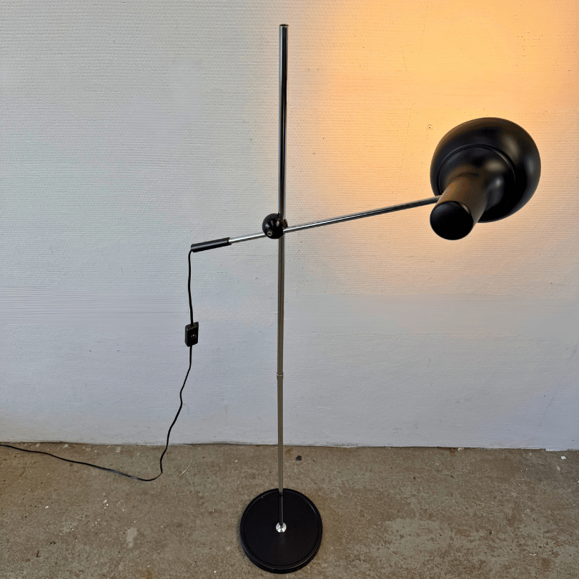 Vintage hengel vloerlamp met chromen frame en zwart metalen kap.