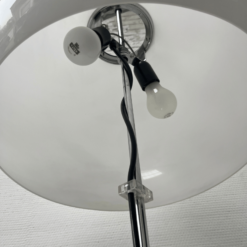 Midcentury Italiaanse vloerlamp met verstelbare witte mushroom kap en chromen basis.