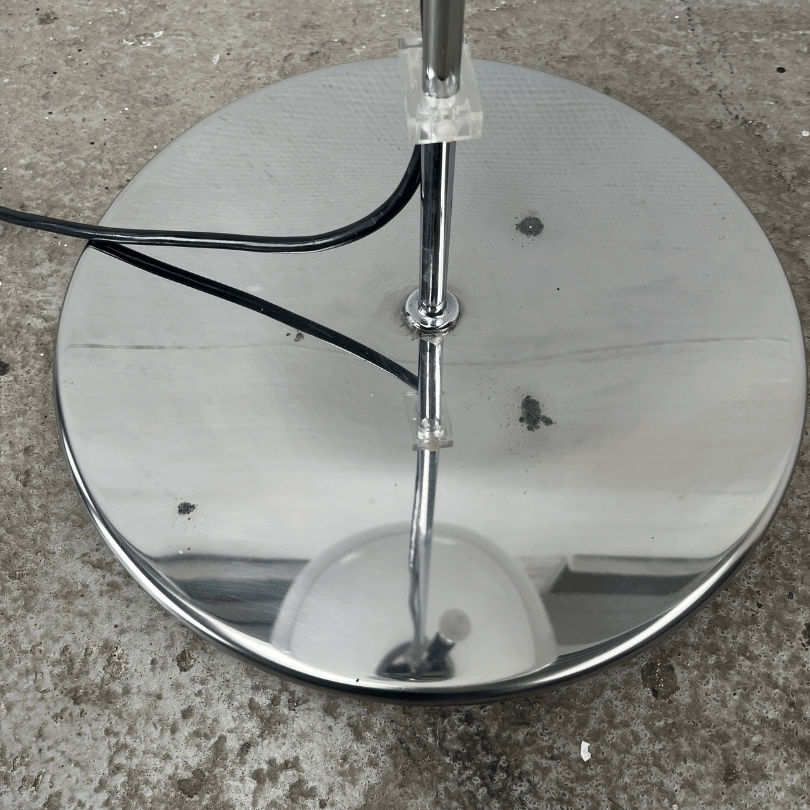 De lamp heeft een slanke, verchroomde basis. De in hoogte verstelbare bolvormige of ‘mushroom’kap van wit kunststof verspreidt een zacht, diffuus licht dat zorgt voor een warme sfeer. De combinatie van chroom en glas geeft de lamp een futuristische flair, typerend voor de Space Age esthetiek van de jaren ’70.