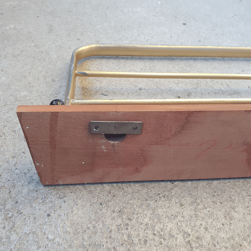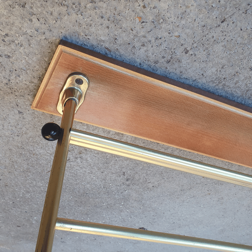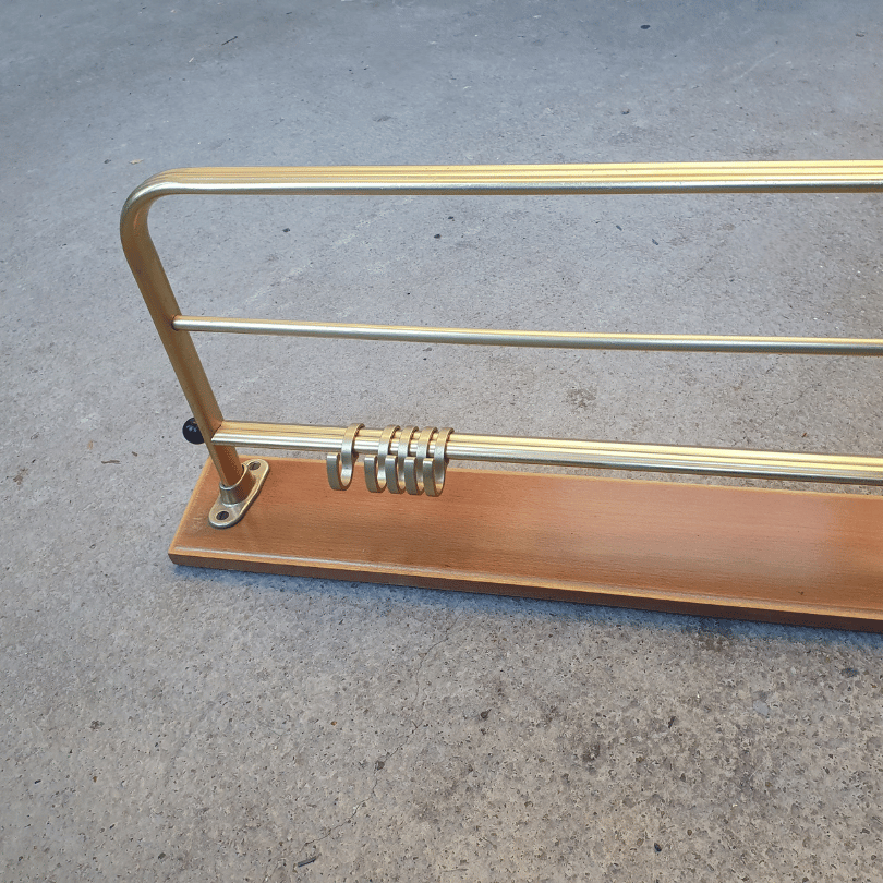 Deze vintage wandkapstok is zo’n subtiel stijlstatement dat meteen sfeer brengt in je hal, keuken of slaapkamer. Het ontwerp combineert een warme houten muurplank met goudkleurig aluminium buizen, wat zorgt voor die typische midcentury‑uitstraling: luchtig, elegant en functioneel in één.
