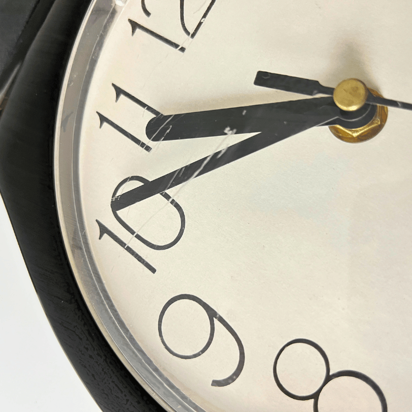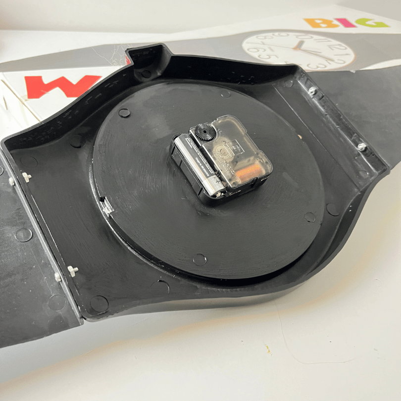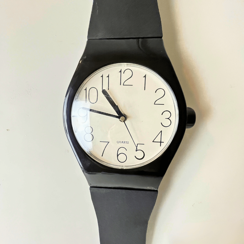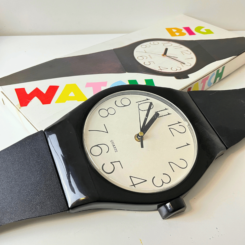 Wandklok in de vorm van een horloge – typisch een model uit de jaren ’80.