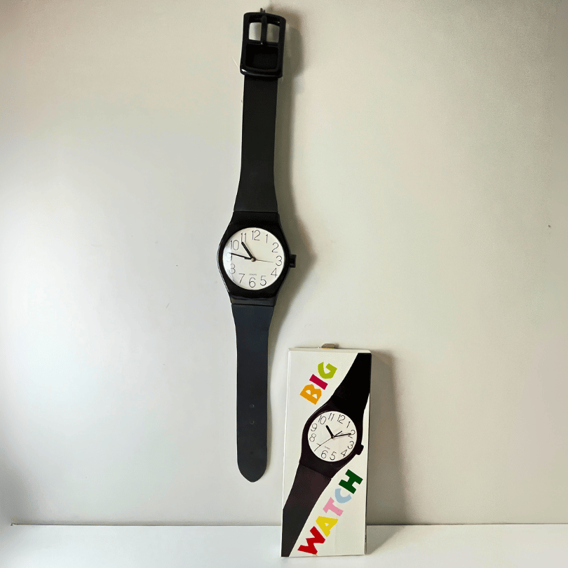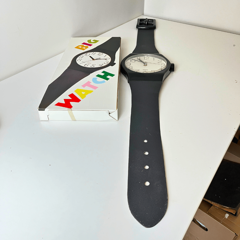 Deze speelse wandklok van kunststof uit de jaren ’80 is een echte blikvanger: vormgegeven als een oversized horloge naar voorbeeld van de toentertijd populaire Swatch. Dit exemplaar is nog inclusief de originele doos — een zeldzaamheid op zich. Het ontwerp is typisch voor die tijd: humoristisch, grafisch en nét een tikje over the top. Perfect voor een hal, keuken, kantoor of kinderkamer waar je graag een knipoog toevoegt. Een fantastisch verzamelobject in zwart wit voor liefhebbers van retro design, popcultuur en iconische jaren ’80‑vormgeving.