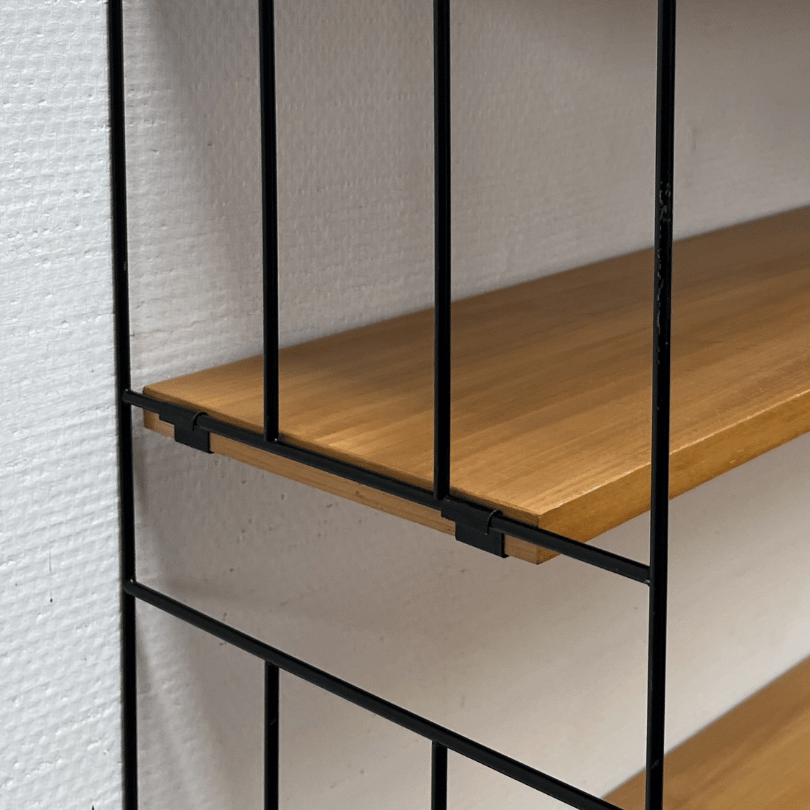 De lichte, warme houttint en strakke zwarte lijnen – zowel horizontaal als verticaal – vormen samen een decoratief én praktisch meubelstuk. Ideaal voor boeken, planten, keramiek of kunstobjecten. De asymmetrie van de smallere plank voegt een speels accent toe, zonder afbreuk te doen aan de balans.