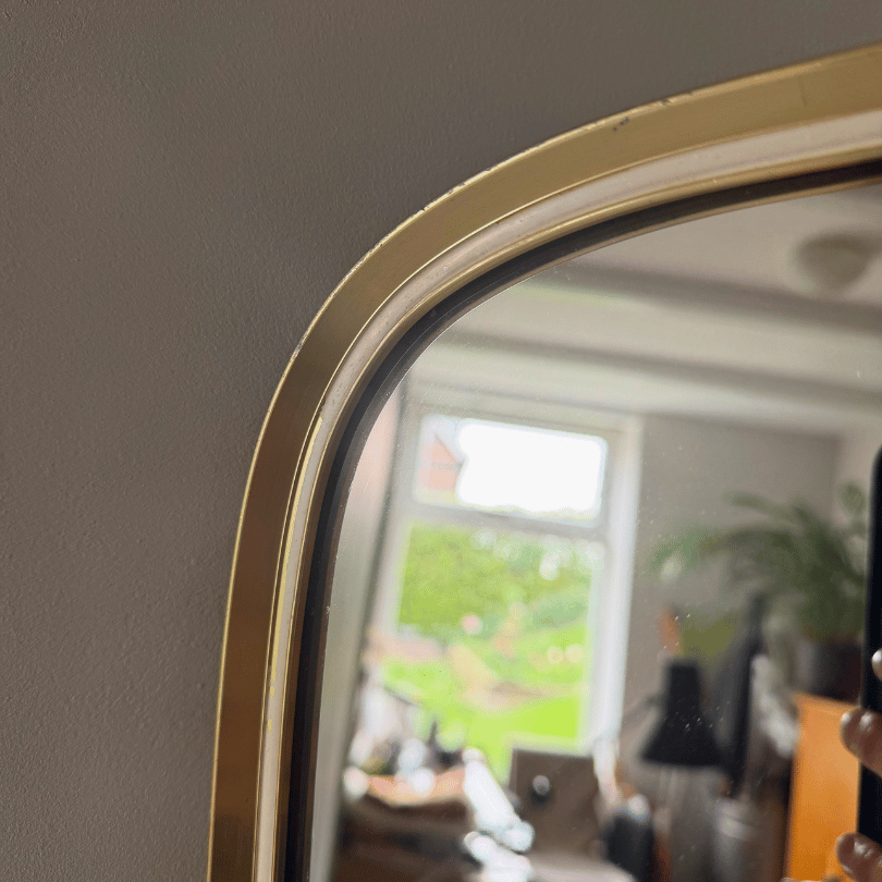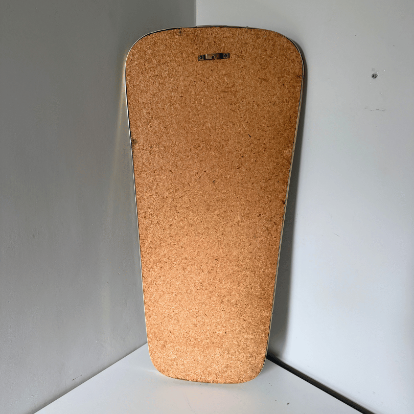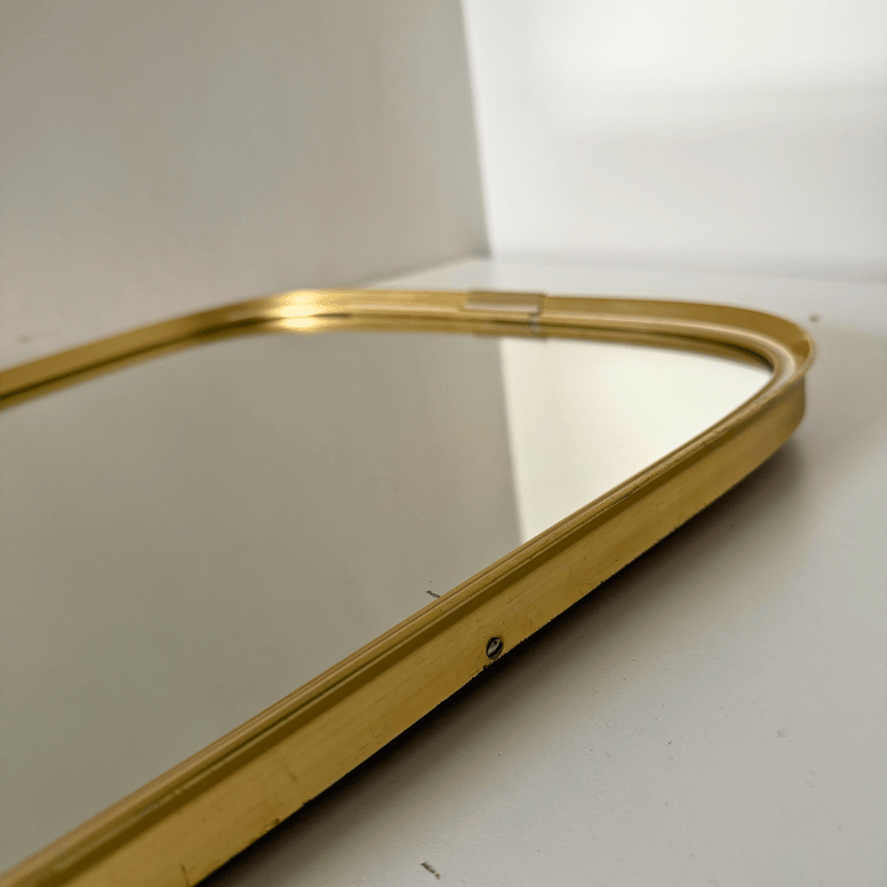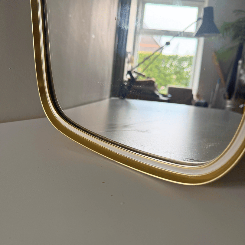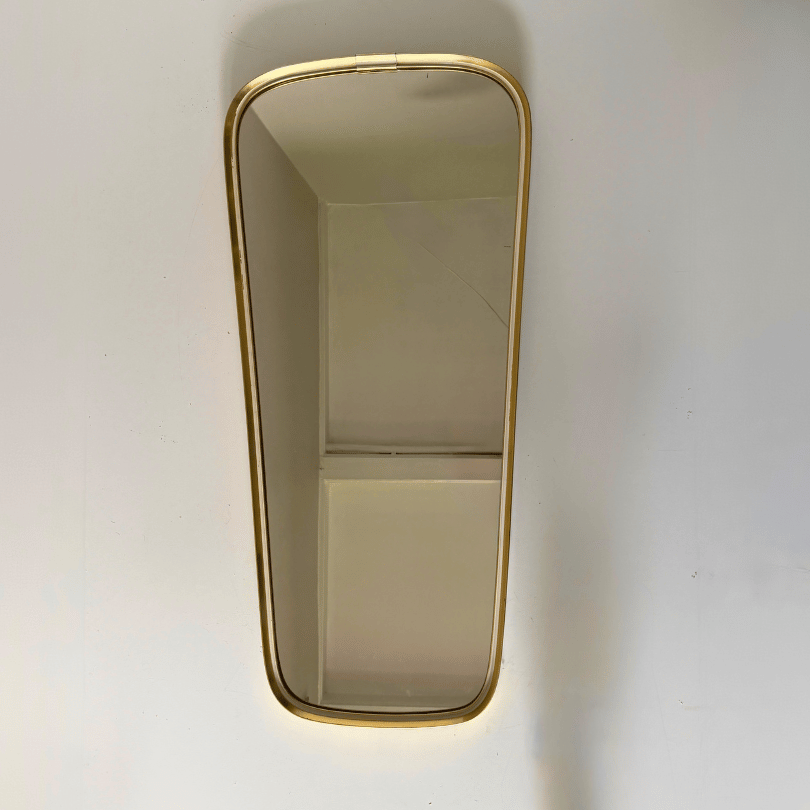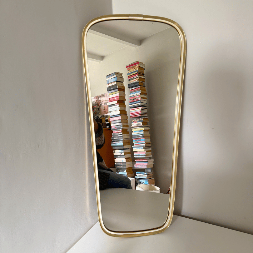 Deze flinke vintage spiegel valt op door zijn elegante, subtiel taps toelopende vorm — een kenmerk dat je vaak ziet in midcentury design. De afgeronde hoeken en het subtiel glanzende goudkleurige aluminium frame met ecru details geven hem een rustige, verfijnde uitstraling die moeiteloos past in zowel moderne als warm vintage interieurs. Door zijn slanke silhouet werkt hij perfect in de hal, slaapkamer of boven een dressoir. Een tijdloos stuk dat niet alleen reflecteert, maar ook sfeer toevoegt aan de ruimte.